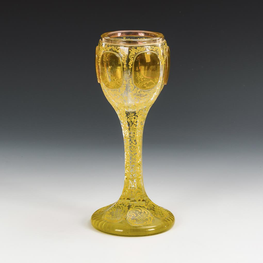 Sechsfach facettiertes Glas mit bauchiger Kuppa, Stängel und Rundfuß. Auf der Kuppa hochgeschliffene Medaillons, allseitig Rocaillemalerei in Gelb. Gold berieben, 2 Fehlstellen der Gelbbeize.
