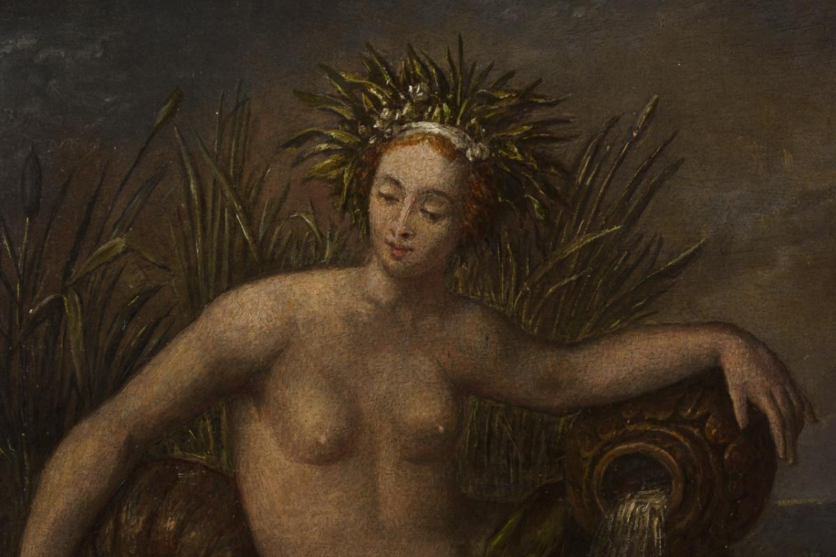 In barocker Malweise ausgeführtes Genrebild der Allegorie des Wassers mit einem die Amphoren ausgießenden weiblichen Halbaktes am Ufer des Meeres in felsiger Landschaft unter wolkigem Himmel. Leichte Altersspuren.