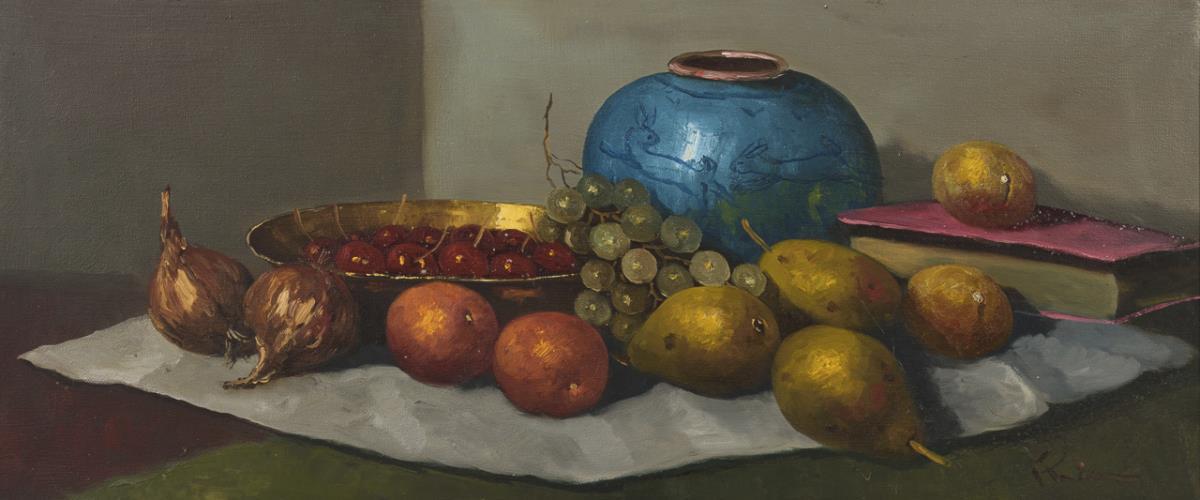 Kirschen in einer Schale neben Trauben, Birnen und Zwiebeln auf einem Tisch.