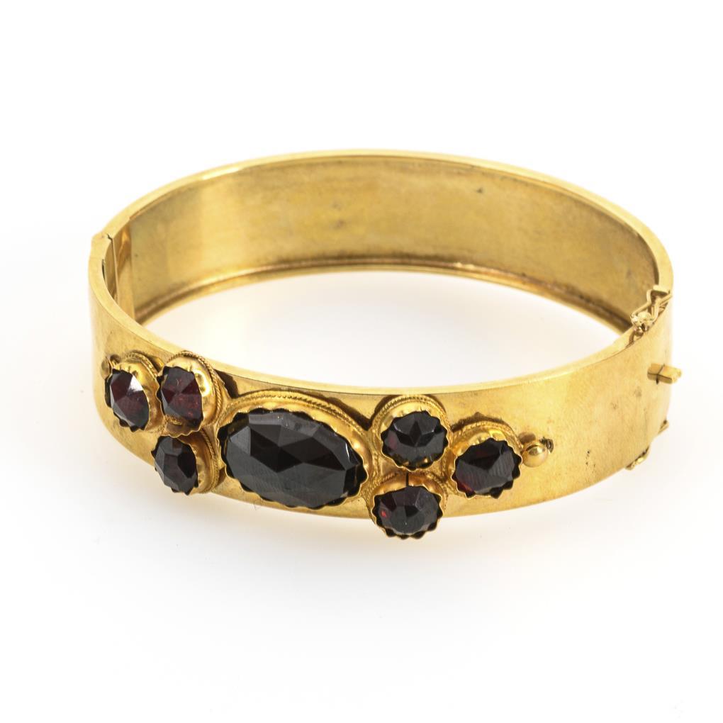 Ovaler Klappreif mit schauseitig montiertem Granatbesatz. Kastenschloss mit 2 Achtersicherungen.