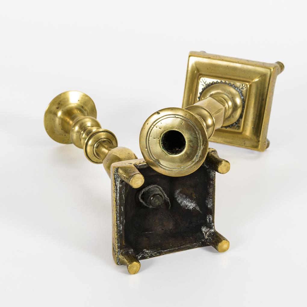 Massive Bronzeleuchter mit dezenter Gravur auf dem Quadratfuß sowie Baluster und schlanke Vasentülle. Alters-/Gebrauchsspuren.