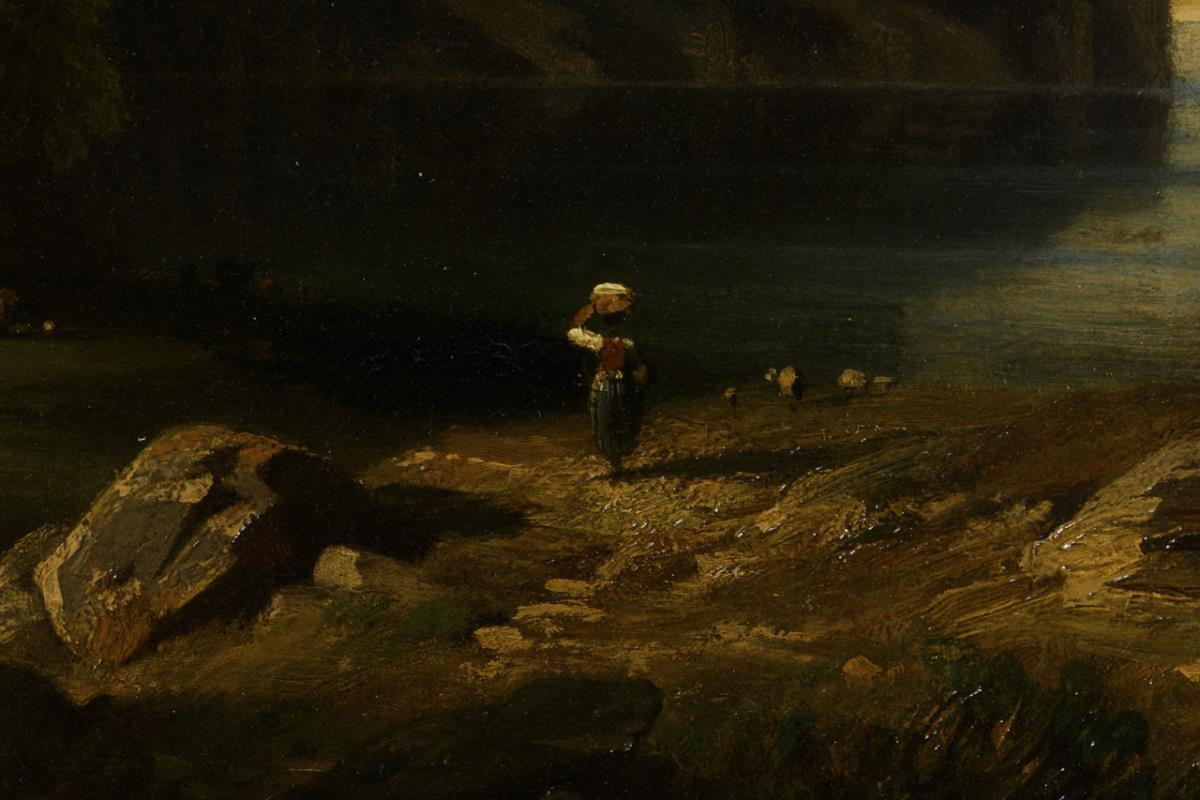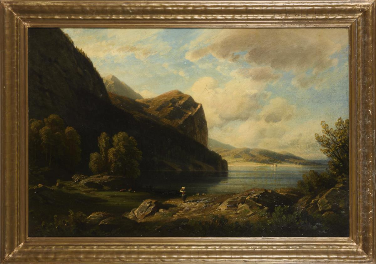 Gebirgssee im idyllischen Sonnenschein mit Staffage nahe dem Schatten der Berge. Altersspuren.