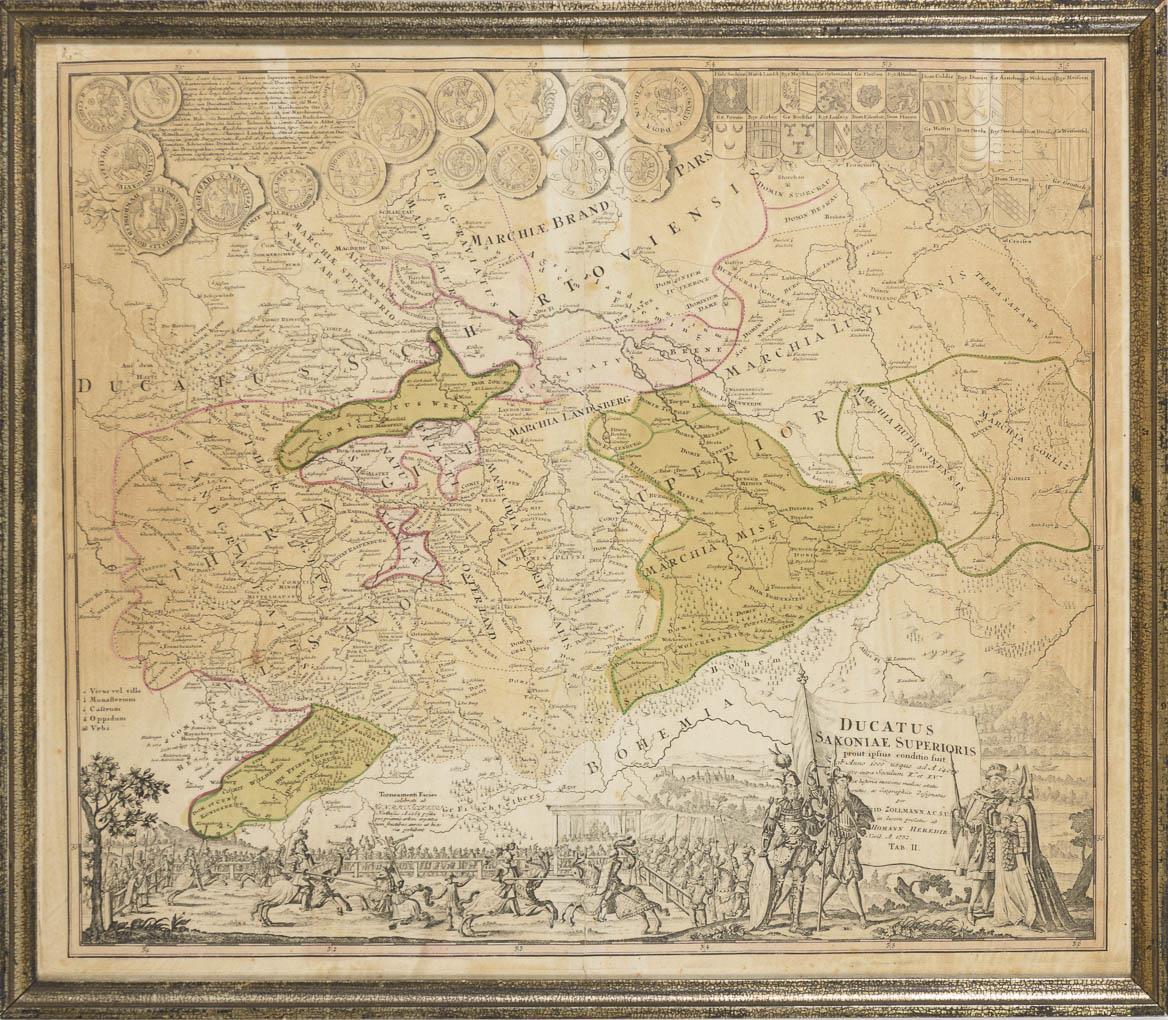 Geschichtskarte des thüringisch-sächsischen Gebietes mit Herrschaftsgebieten zwischen dem 11. und 15. Jh., mit verschiedenen Wappen und Siegeln sowie Darstellung eines Ritterturniers, figürliche Titelkartusche, bezeichnet: "Ducatus Saxoniae Superioris prout ipsius condition fuit ab Anno 1000 usque 1400 [...]"; Entwurf des Archivars, Historikers und Kartografs Friedrich Zollmann (1690 Gotha - 1762 Weimar). Bugfalte, Lichtschaden, etwas stockfleckig.