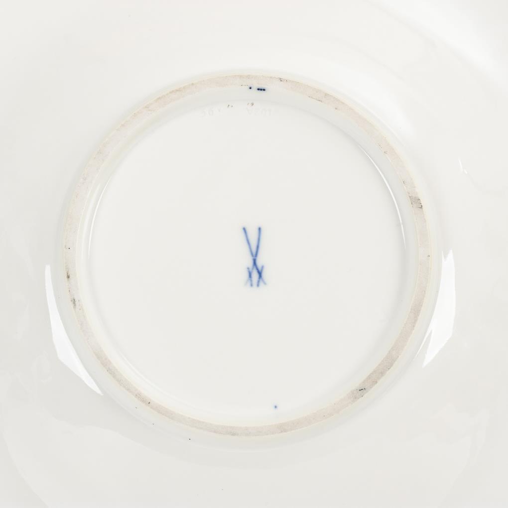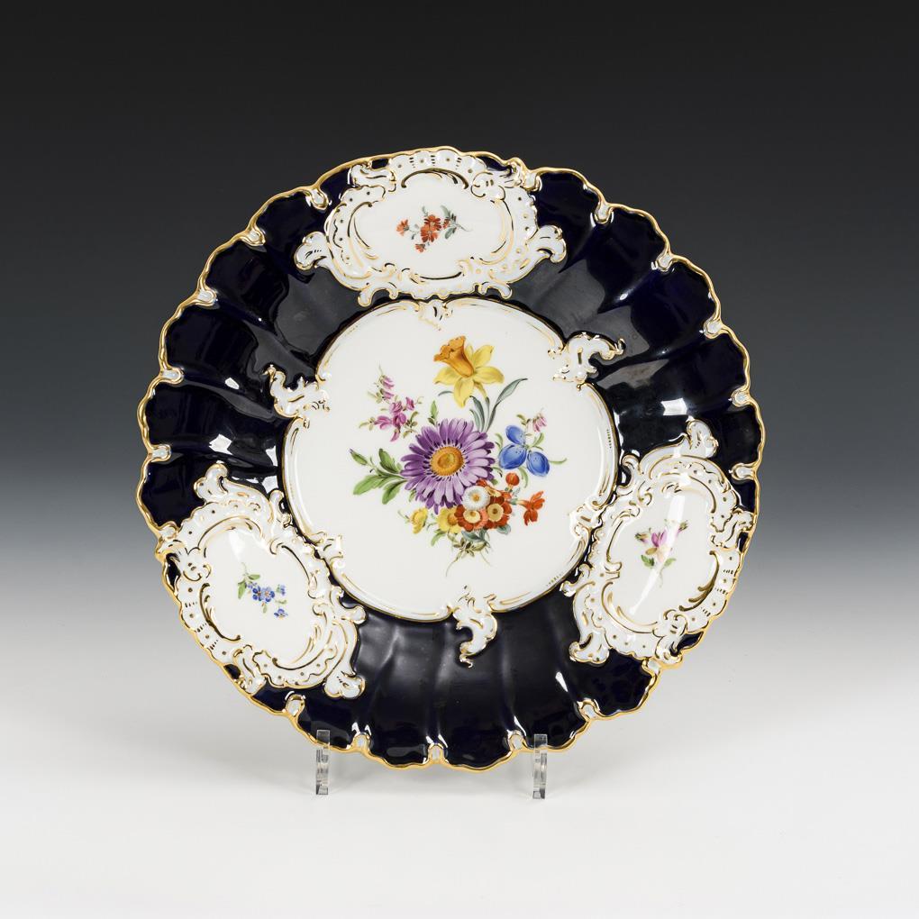 Kobaltblauer Teilfond, polychrome Blumenmalerei, Goldstaffage. Ø 30 cm.