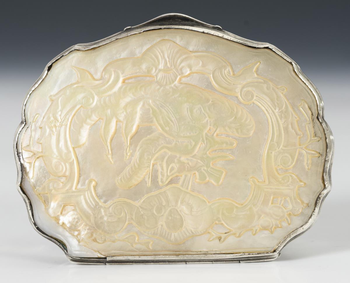 Passige Form mit undeutlichem, wohl mythologischem Deckelbild (Frau und 2 Kraniche). Unterseitig verschlungene Monogrammgravur „WW“. Perlmutt am Rand repariert, Oberfläche stark abgegriffen.