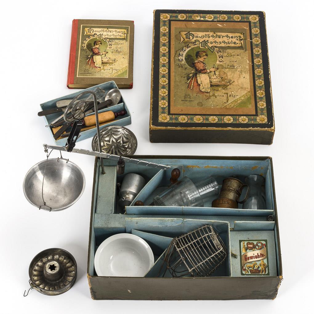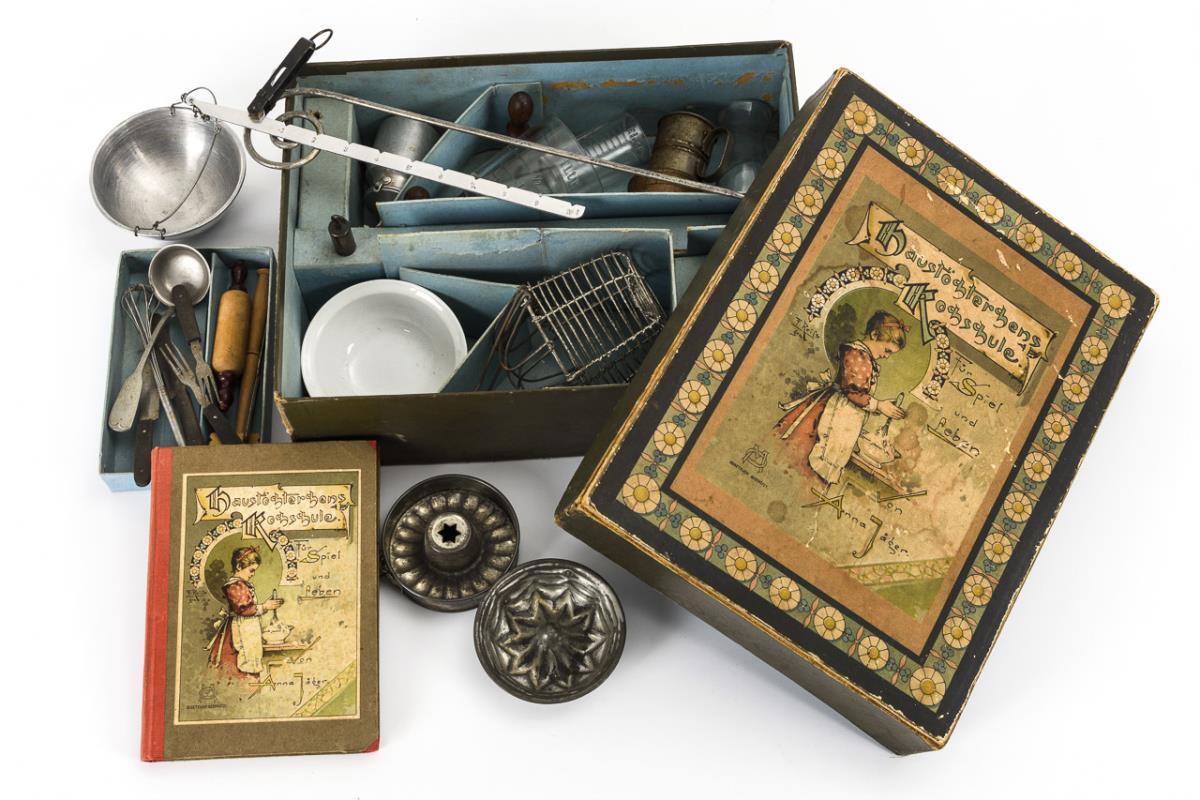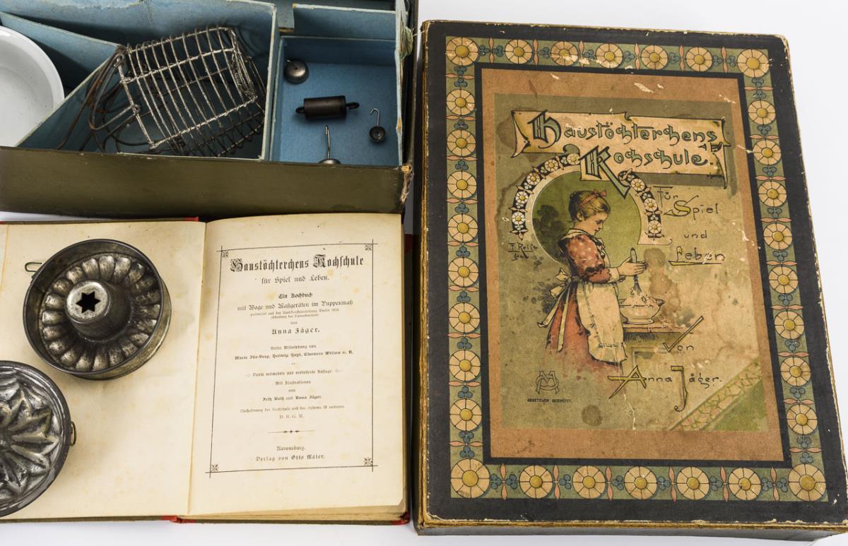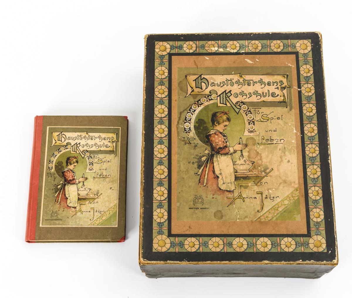 Seltenes Set "Haustöchterchens Kochschule für Spiel und Leben" mit Kochbuch. Von Anna Jäger.