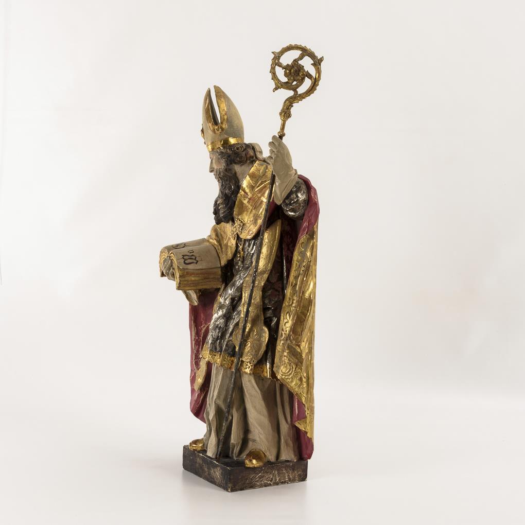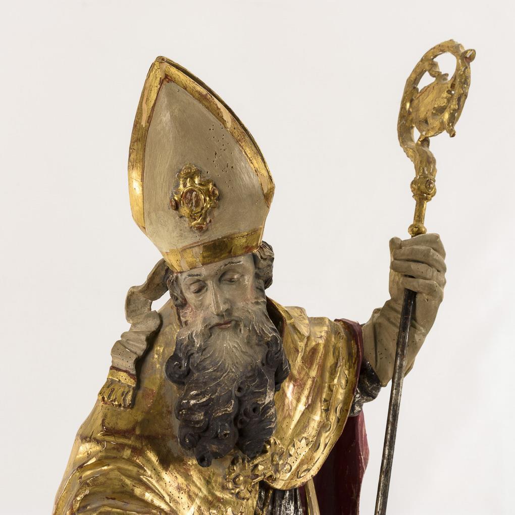 In barocker Bewegtheit und Faltenfülle gestaltete Figur des Bischofs mit Krummstab und Buch. Auf dem Buch eine Beschriftung: "Wo Glaube". Alters-/Gebrauchsspuren.