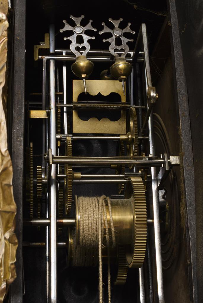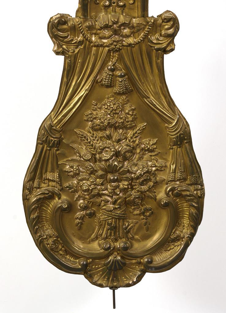 Getriebenes und geschnittenes Messingblech, Eisen. Uhr 47 x 36 x 18 cm | Pendel L 109 cm.