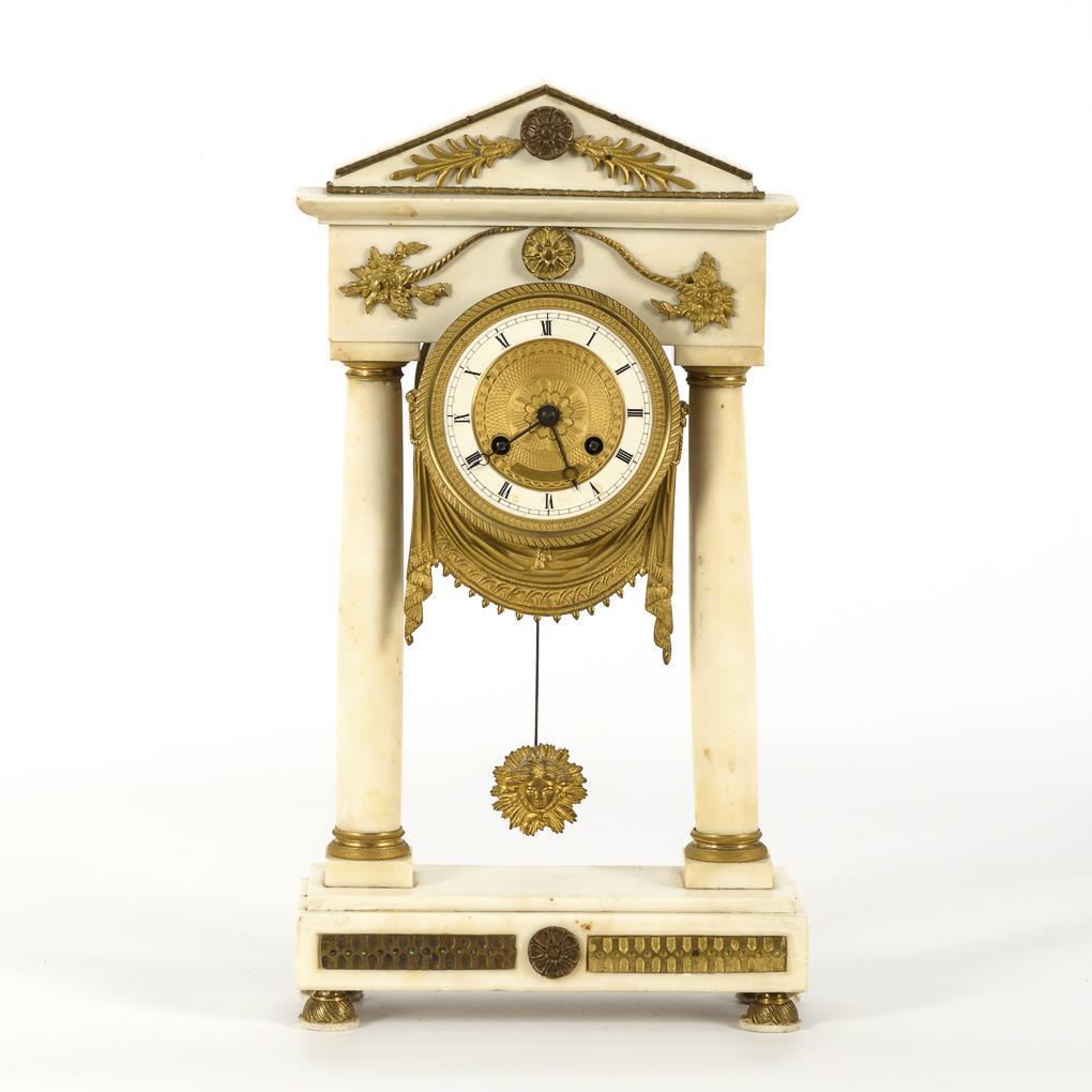 Säulenuhr mit Dreiecksgiebel, floralen Applikationen und einem Festontuch. Alters- und Gebrauchsspuren, Glas mit Defekten.