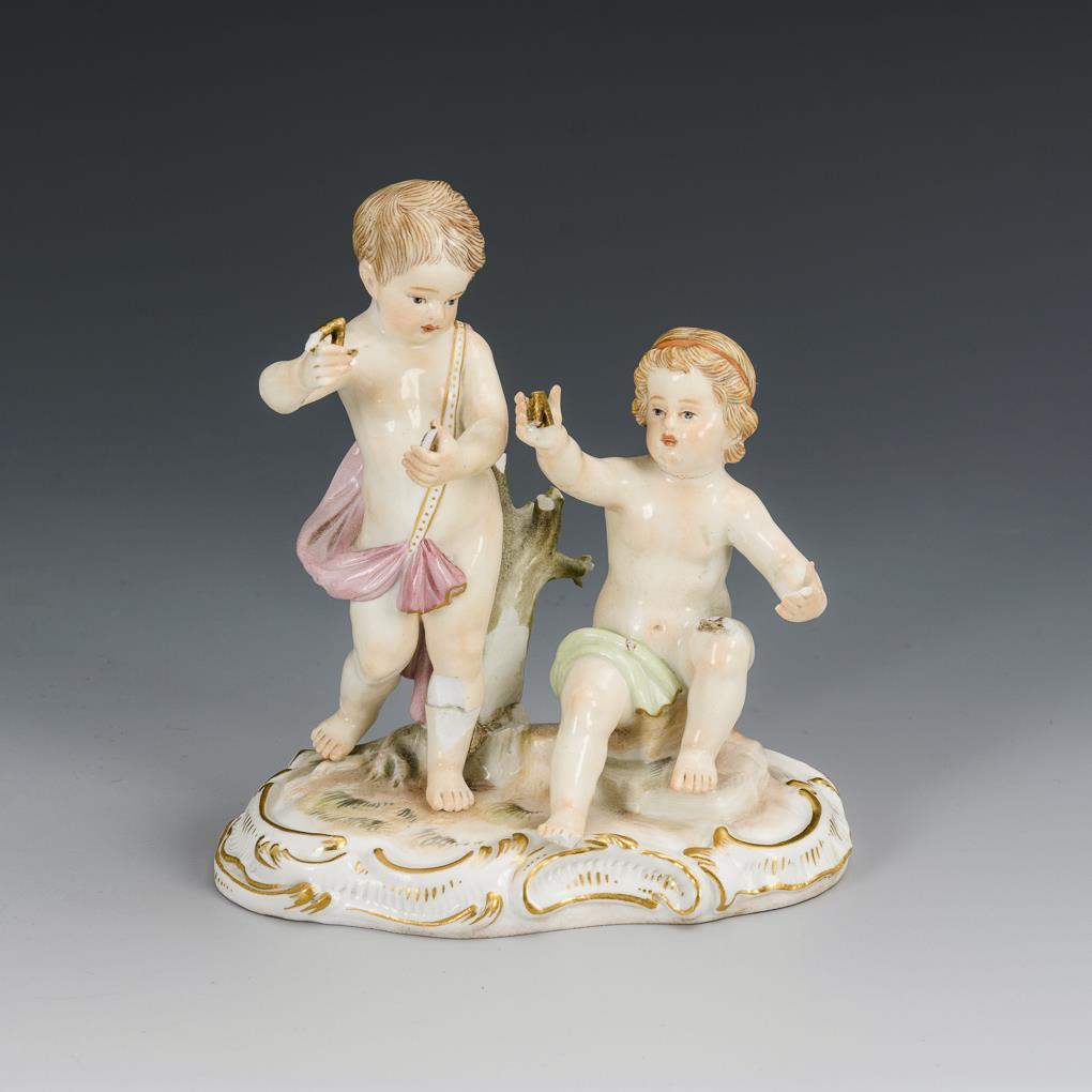 Puttenpaar auf Rocaillesockel. Attribute fehlen (Himmelsglobus, Winkel etc.), 1 Putto mit Baum geklebt, 1 Fuß bestoßen, Baum bestoßen.