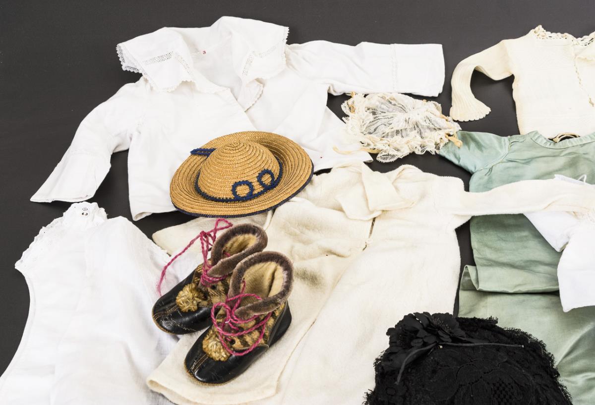 8 Teile alte Babykleidung, für große Porzellankopfpuppen geeignet. Dazu 2 Puppenhüte, 1 Haube und 2 Paar Schuhe. Altersspuren.
