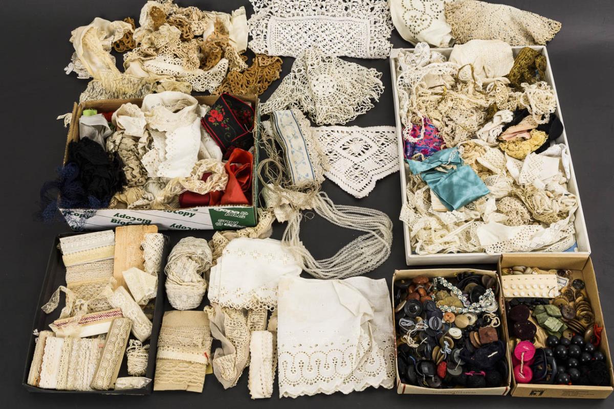 Sammlung zarter Spitzen, verschiedenster Handarbeiten und alter Handarbeitseinsätze, Bänder, Bordüren, 2 Kästchen mit alten Knöpfen. Dazu 12 alte Glasperlenketten.