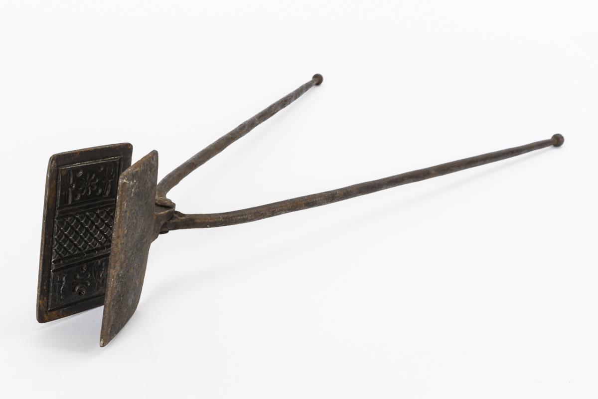 Großes "Waffeleisen" in rechteckiger Form. Beidseitig innen stilisiert florale Negativ-Motive: Herz, Vögel, Pferde und Blumen sowie Waffelmuster. Kaum Alters-/Gebrauchsspuren.