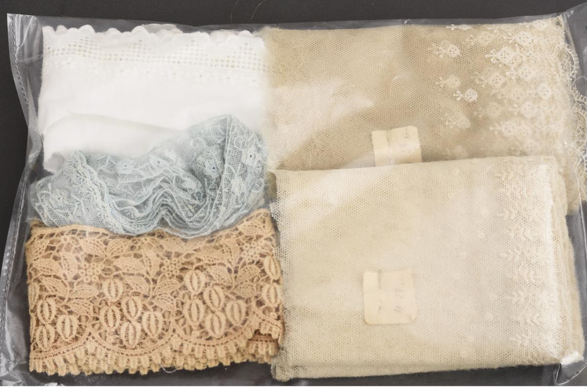 2x sehr zarte Tüllspitzen, je 4,50 m sowie weitere jüngere Spitzen (beige, blau, weiß, mintgrün und schwarz). 10x rot-weiße unbenutzte Borten, 1x 27 m bunte Borte mit Windmühlen, blau-weiß-grüne Blümchenborte. 7 Kunsthaarperücken, Ø ca. 8,5 cm und eine ältere Echthaarperücke, Ø ca. 7 cm. Dazu Strang mit 12 Glasperlenketten.