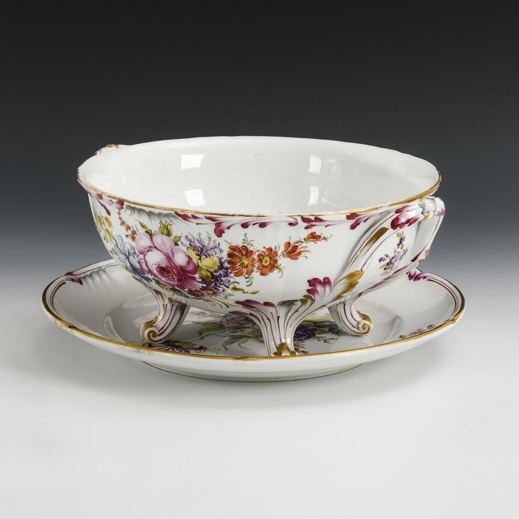 Fayence, weiß glasiert, farb- und goldstaffiert. Schale H 12,5 cm, Ø 25,5 cm | Unterteller Ø 30,5 cm.