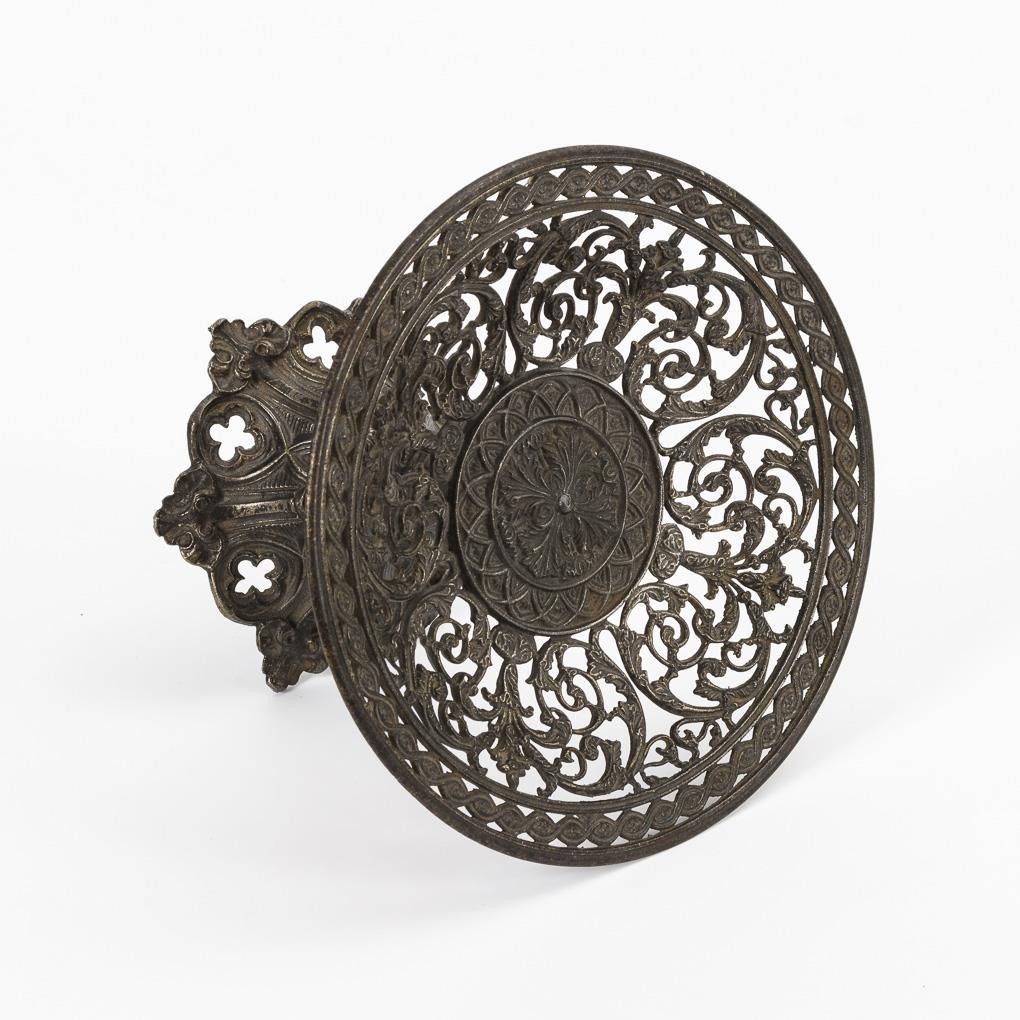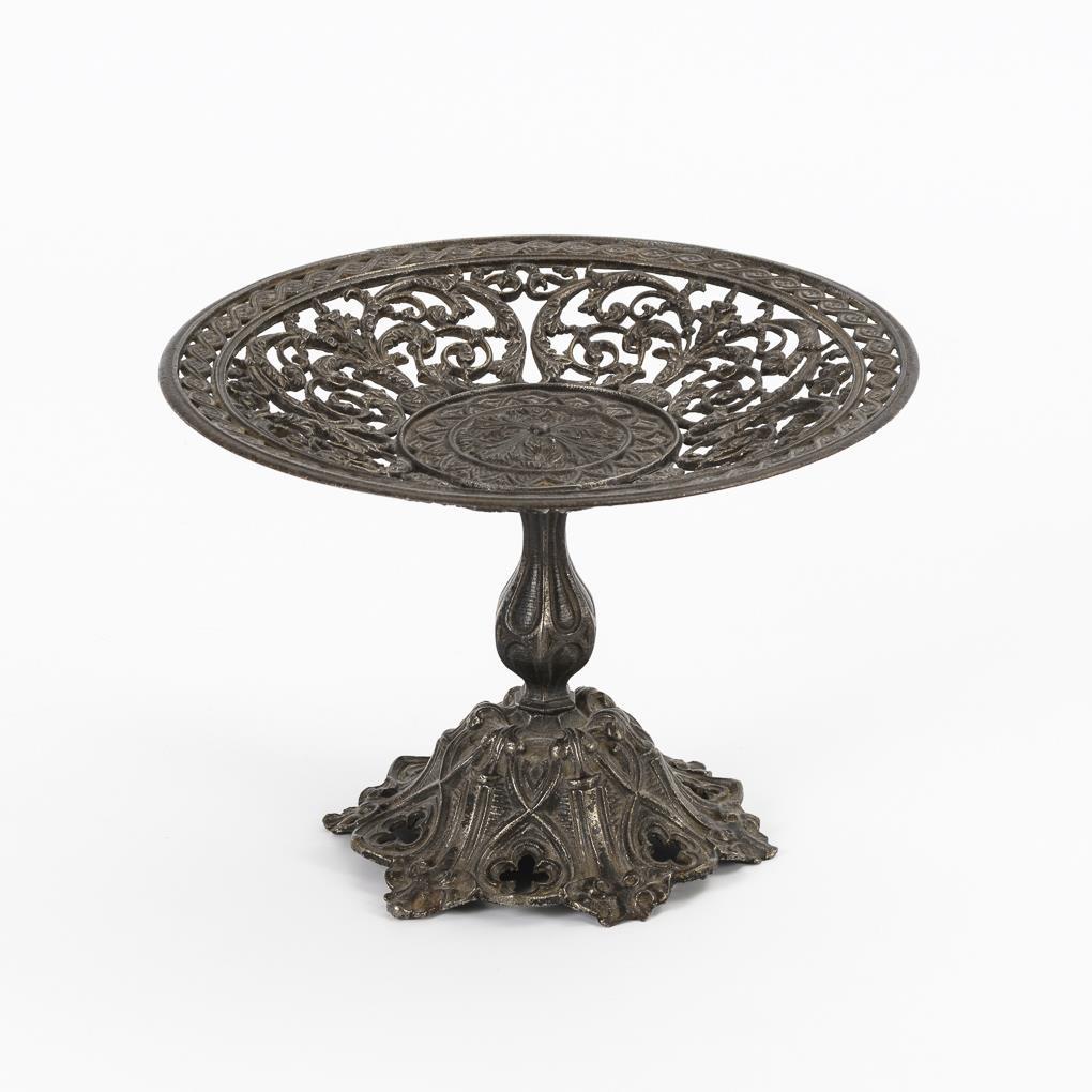 Kelchförmiger Rundfuß mit Reliefzier, Säulenschaft und à-jour gearbeitete Schale mit feinem Rankenmotiv.