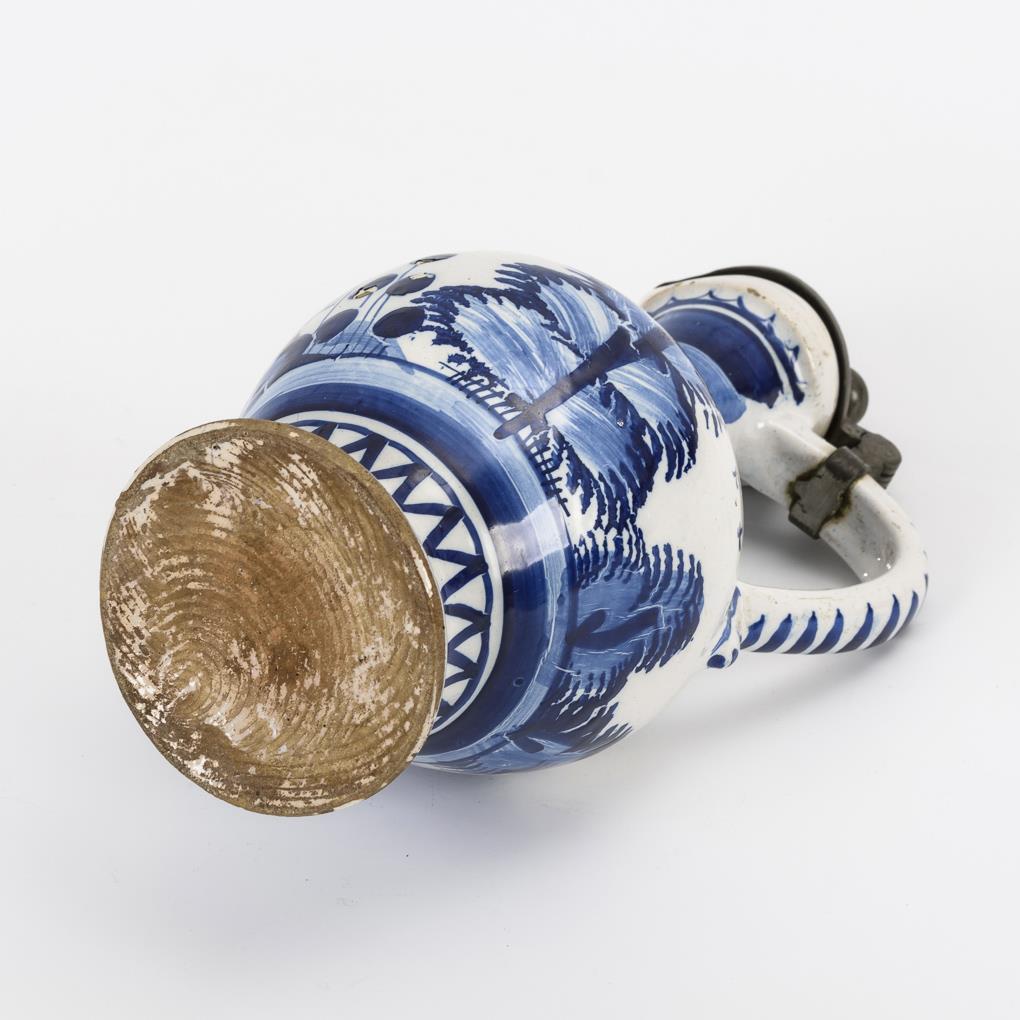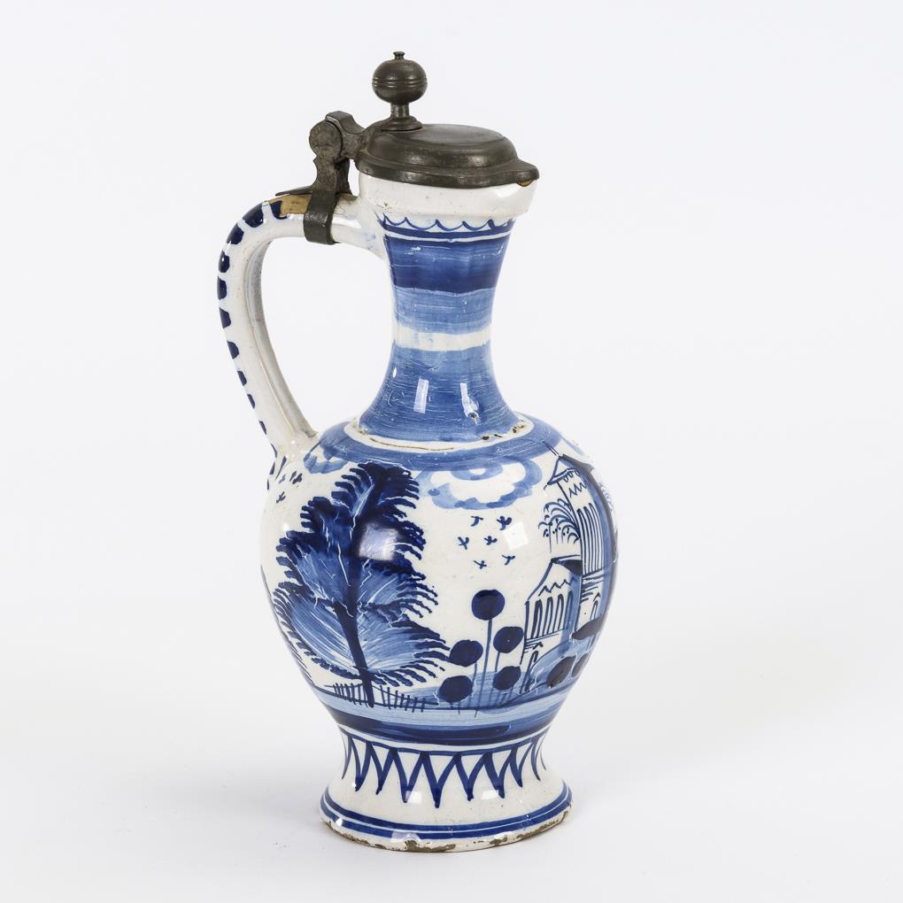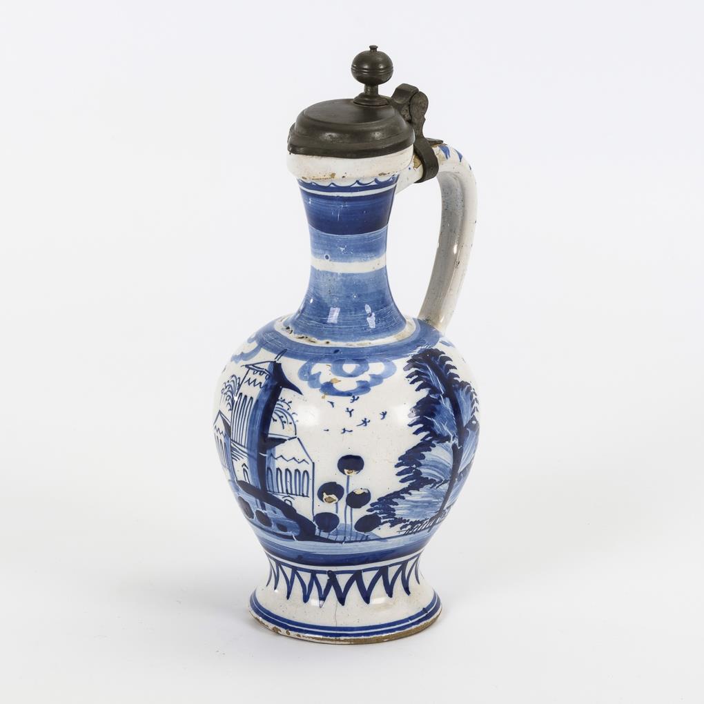 Kugelbauchkrug mit Zylinderhals, Bandhenkel und Rundfuß. Schauseitige Turmarchitektur in skizzierter Landschaft. Zinndeckel mit Kugeldrücker. Glasurdefekte, Haarriss am Stand.