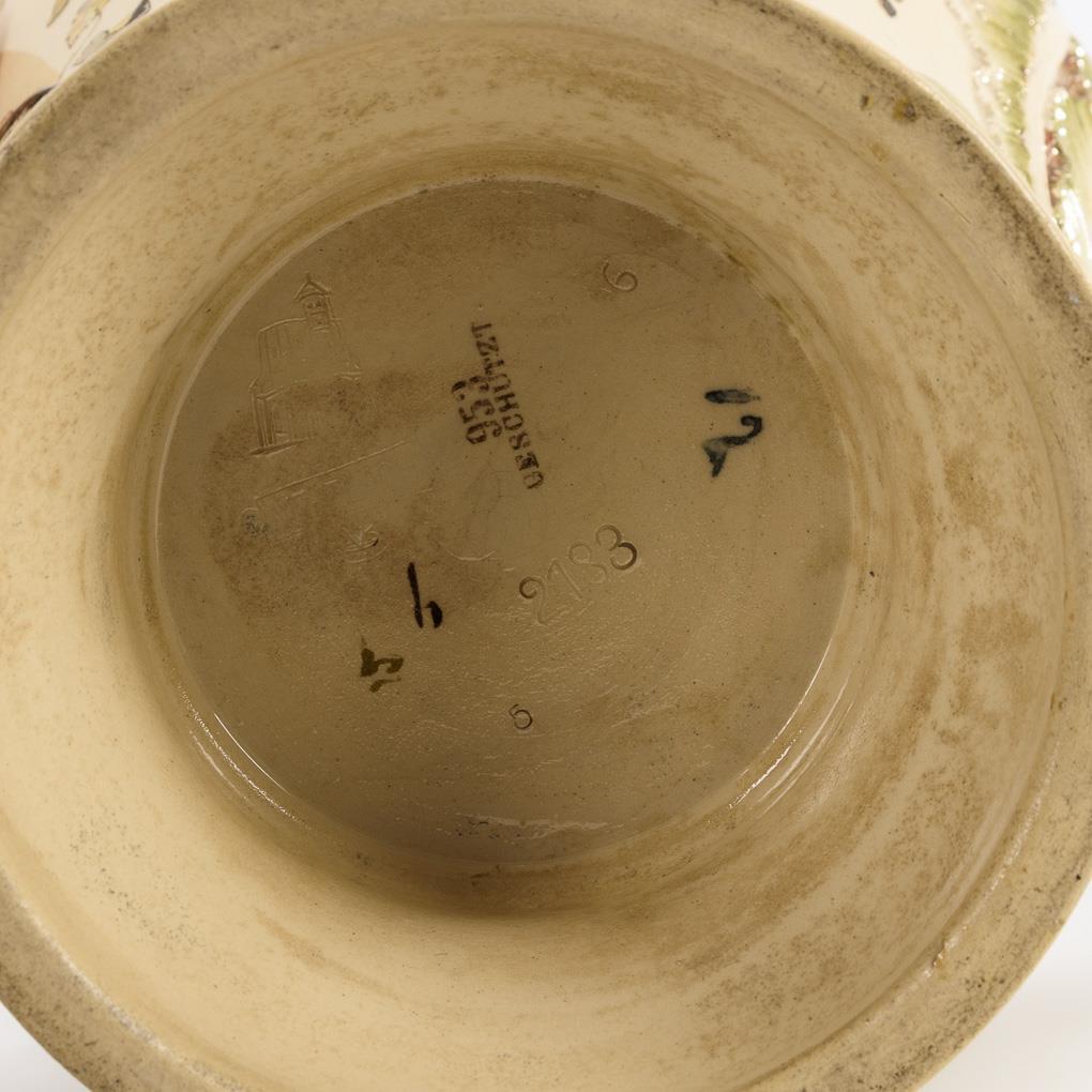 Helles Feinsteinzeug, grün und braun staffiert, farbiger Umdruckdekor. H 36,5 cm.
