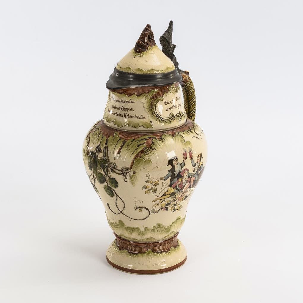 Reliefkanne mit Darstellungen trinkender Zwerge und Trinksprüchen, zinnmontierter Keramikdeckel mit Zwergendrücker.