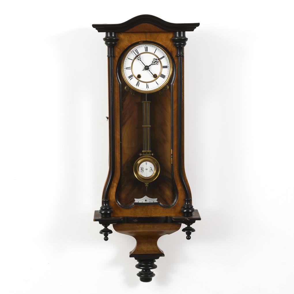 3-seitig verglastes Wanduhrengehäuse mit geschweiftem Giebel, aufgelegten Halbsäulen und Konsolabschluss mit Drechselzier. Bekrönung fehlt. Halbstundenschlag entfernt, partiell Bereibungen, Furnierdefekte und Risse, inaktiver Anobienbefall.