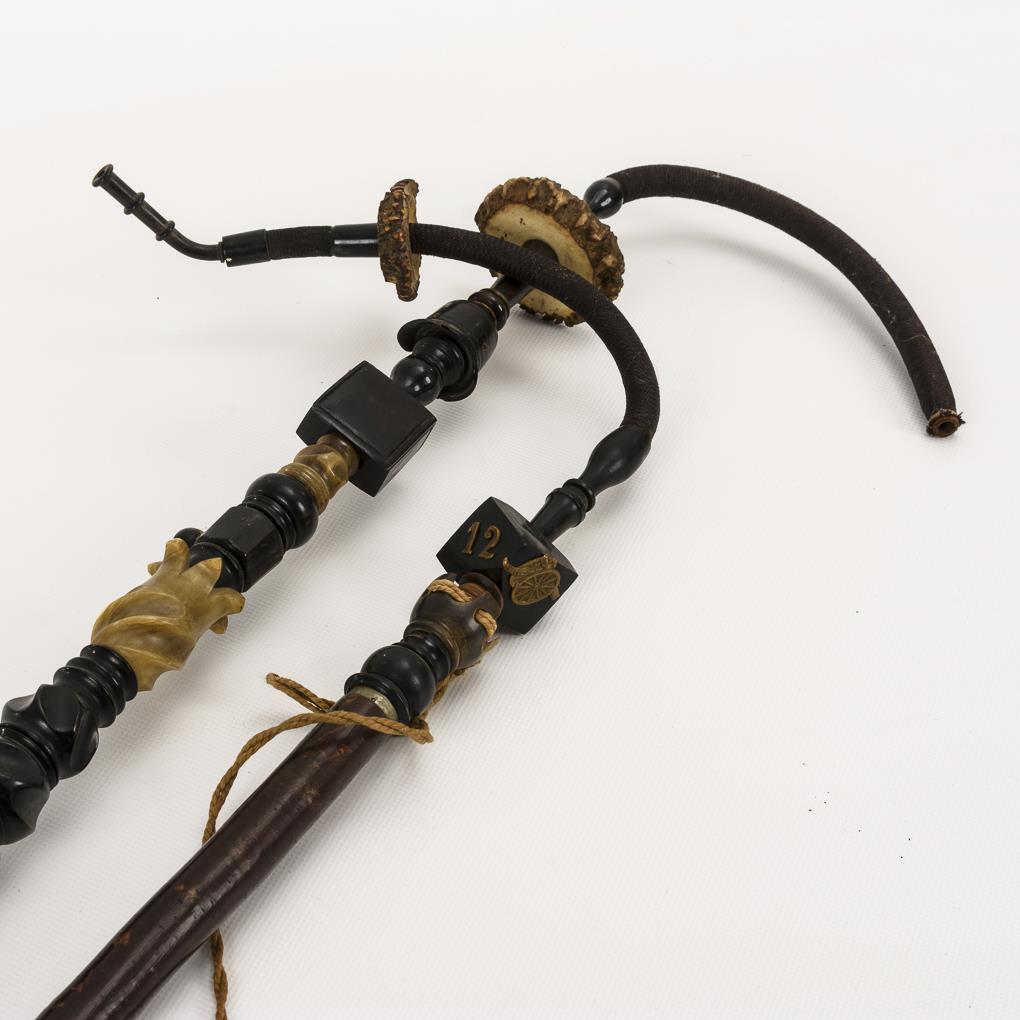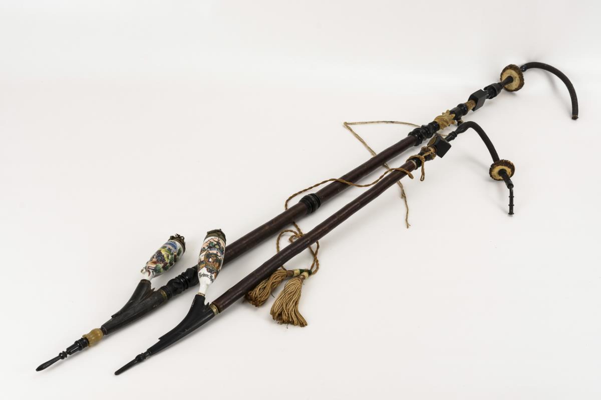 Porzellan teils reliefiert, kolorierte Vordrucke, teils Handbeschriftung, Metalldeckel. Weichselholme mit Horn, Hirschrose und biegsamen Schlauch. L maximal 165 cm.