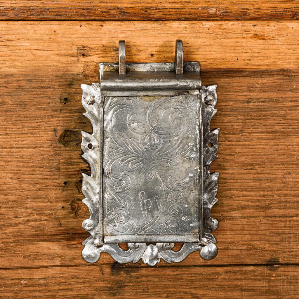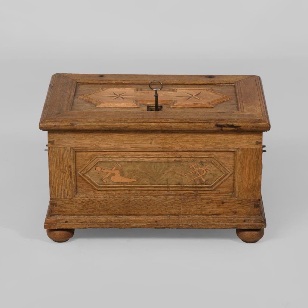 Kleine kastenförmige Lade mit seitlichen Bügelgriffen und kassettierten Feldern, intarsiert mit Zunftzeichen der Zimmerer, Datum und Sternen; innen mit kleinem Beifach. Restauriert, Schloss ergänzt.