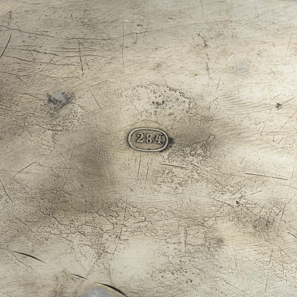 Platte mit stilisierten Trauben und Rippen, Schale mit teils freigestellen Schleifenlinien. Geringe Lötreparatur an der Schale, je einige Alters-/Gebrauchsspuren.