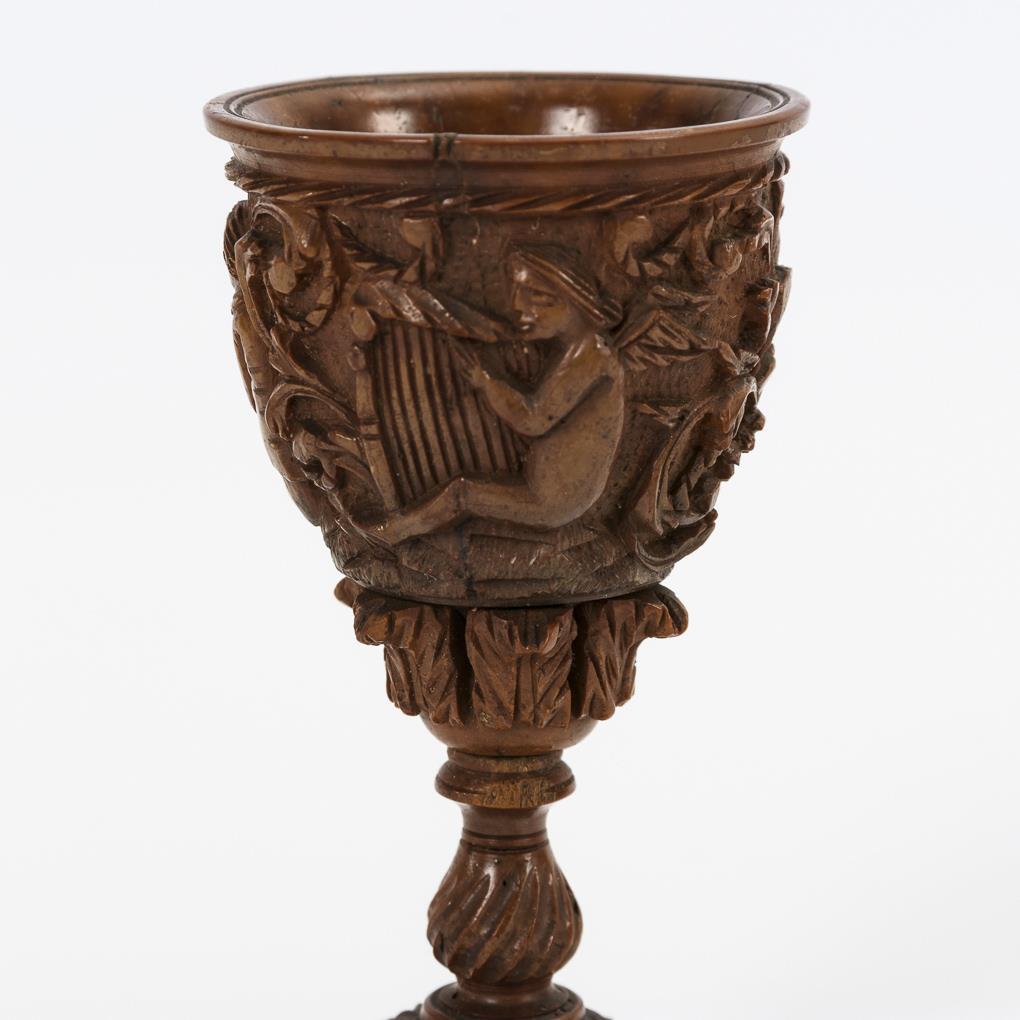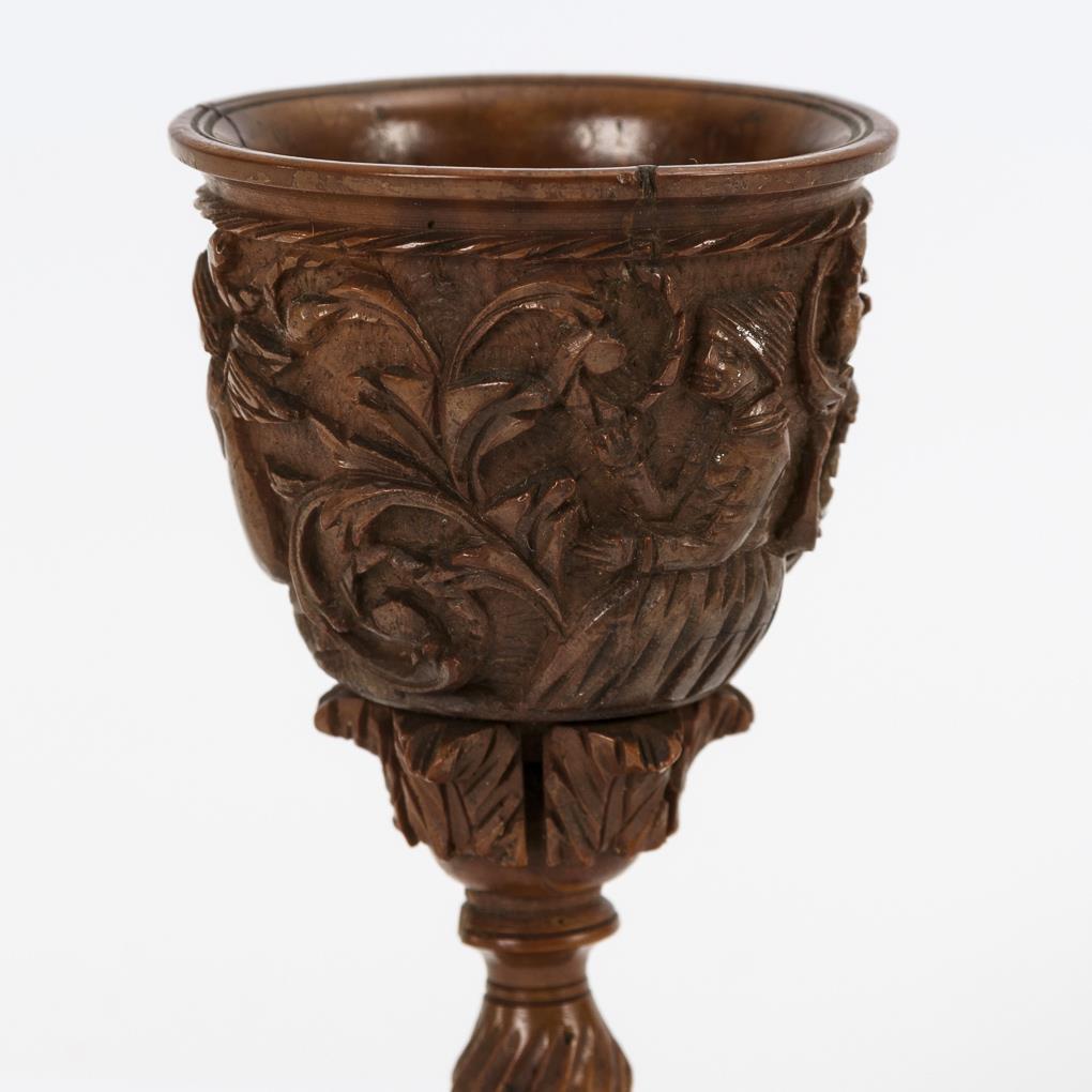 Gedrechselter Elfenbein-Becher. Umlaufend beschnitzter Holzbecher (Paar und Engel im Rankenornament). Minimale Haarrisse und winzige Randkerbe im Holz.