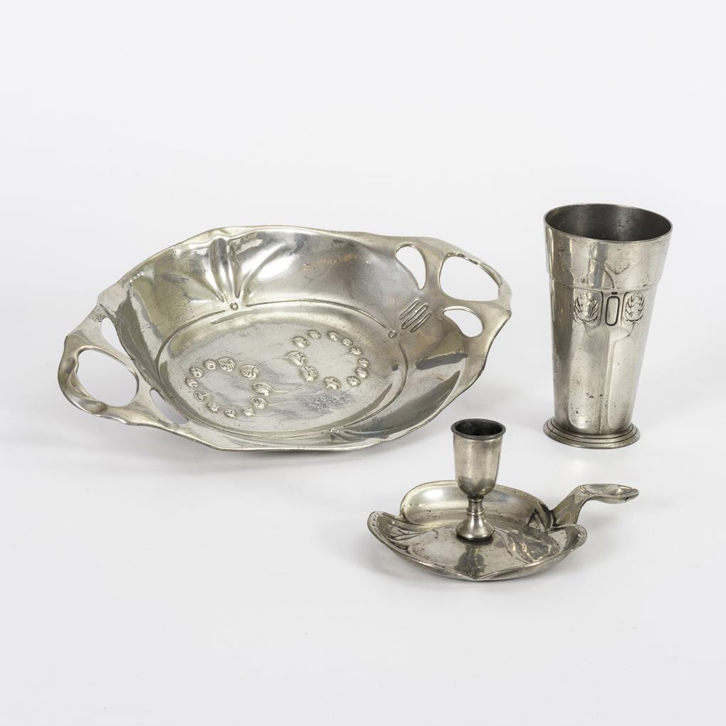 3x Jugendstil-Silberzinn: Schale, Becher und Kerzenleuchter. Norica, Electra und Kayserzinn.