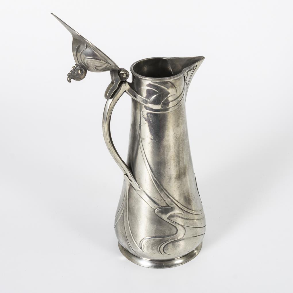 Konische Kanne mit stilisiertem Wandungsrelief sowie leerem Wappenschild. Defektes Deckelscharnier, sonst einige wenige Alters-/Gebrauchsspuren.