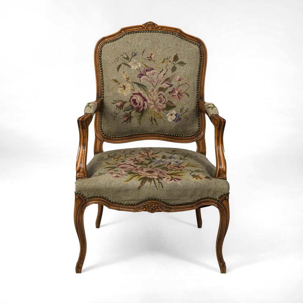 Neobarocker Armlehnsessel in stiltypisch geschwungener Form mit schnitzverziertem Gestell und breiter Sitzfläche, Stickmuster-Bezug mit Blumen und Ziernagelung. Alters-/Gebrauchsspuren, restauriert, Polster und Bezug ergänzt.