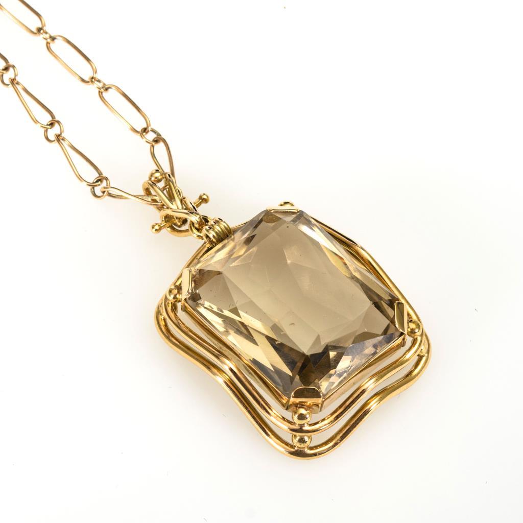 Hellgoldener, krappengefasster Stein in steg- und granalienverziertem Rahmen. Grobe Ankerketten mit Karabinerverschluss.