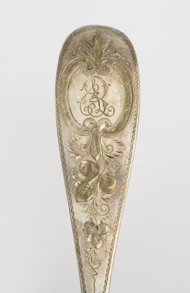 Floral gravierte Löffel mit verschlungener Monogrammgravur "EV". Schwarze Schatulle.