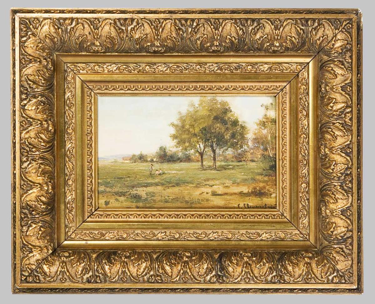 Impressionistisch angelegte weite Sommerlandschaft mit Figurenstaffage. Vergoldeter Stuckrahmen.