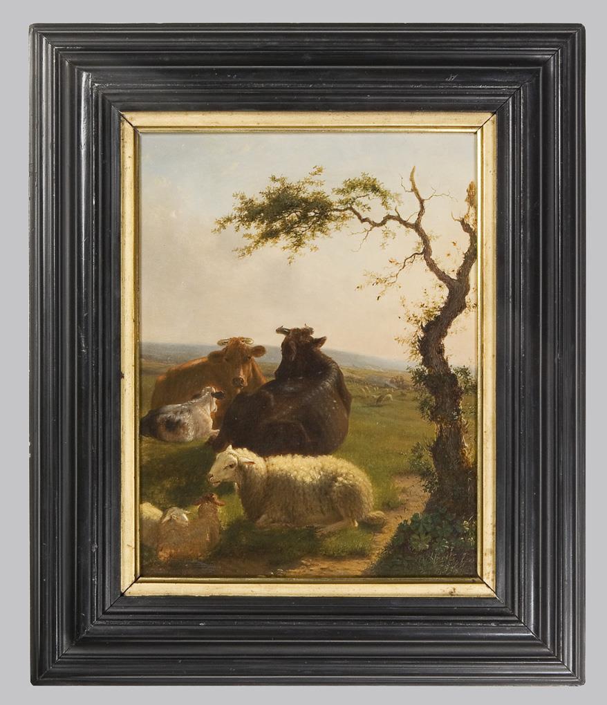 Kühn und modern sind die liegenden Tiere in den Vordergrund plaziert. Sie spielen die Hauptrolle in der Hügellandschaft. Geschwärzter Profilrahmen mit Goldleiste.
