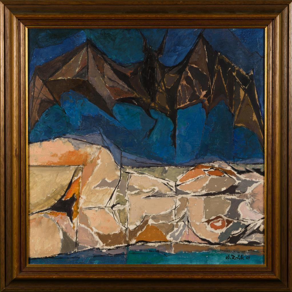 Liegender weiblicher Akt mit großer Fledermaus darüber.
