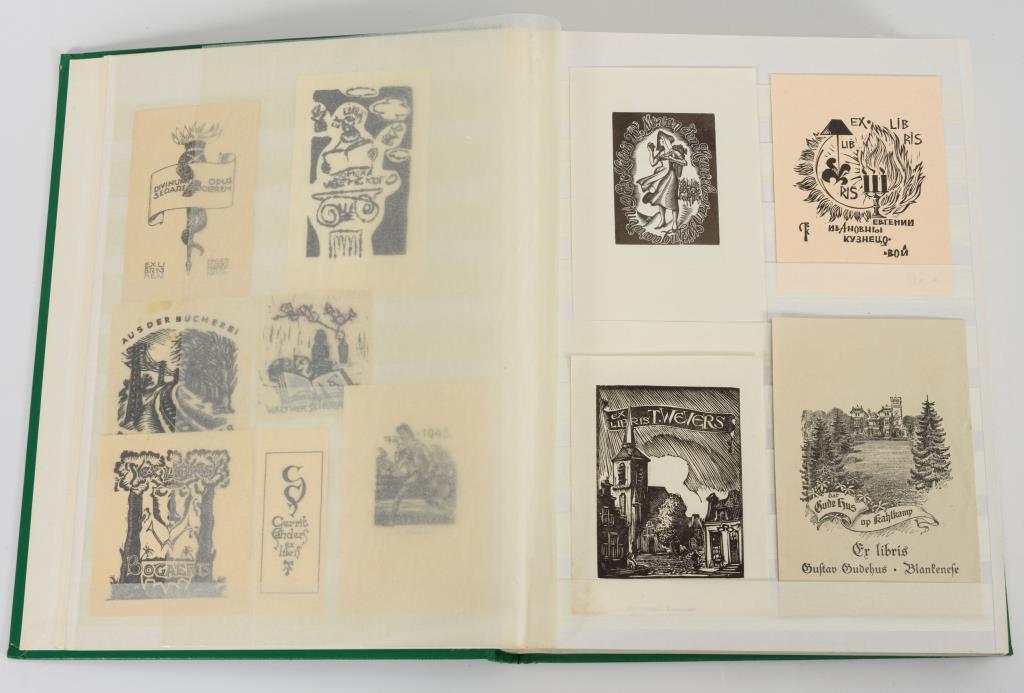 Buchzeichen aus dem gesamten 20. Jahrhundert. In grünem Briefmarkenalbum.