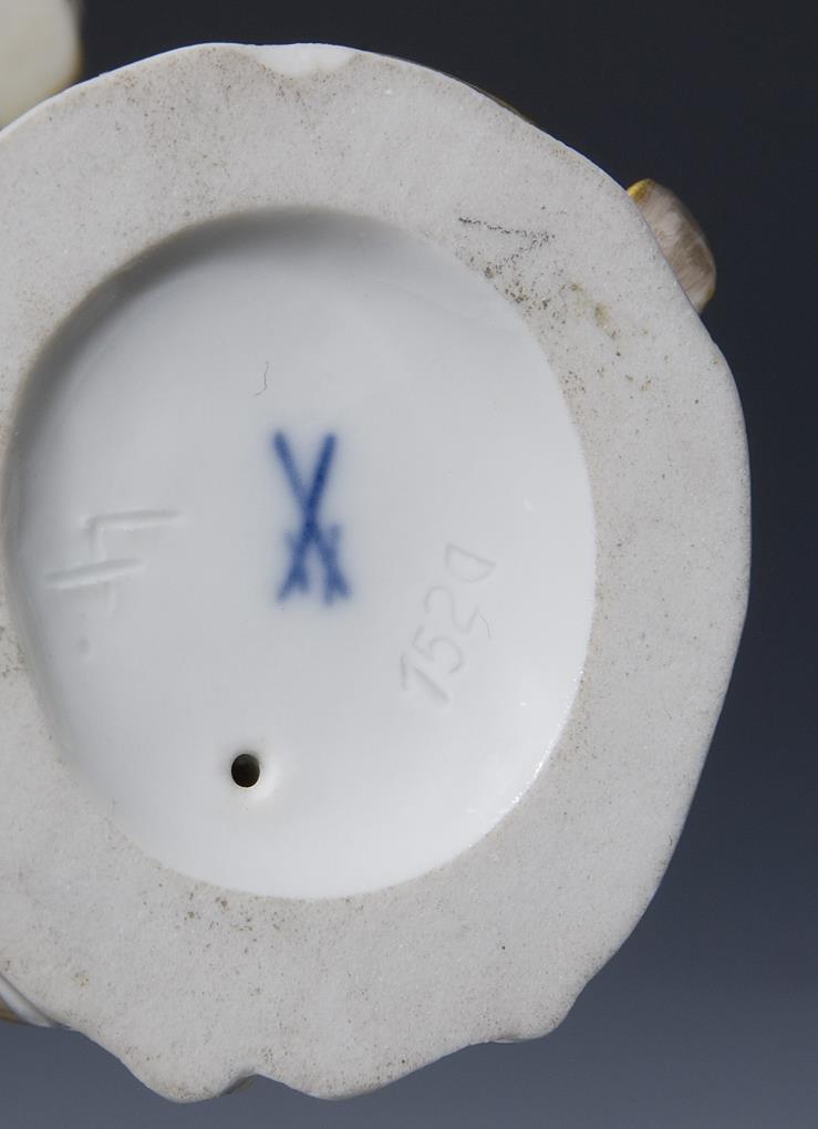 Modell von Peter Reinicke 1753-1754. Farbig bemalt, gold staffiert. Ritzmarke, Pressmarke, Schwertermarke. Henkel geklebt.