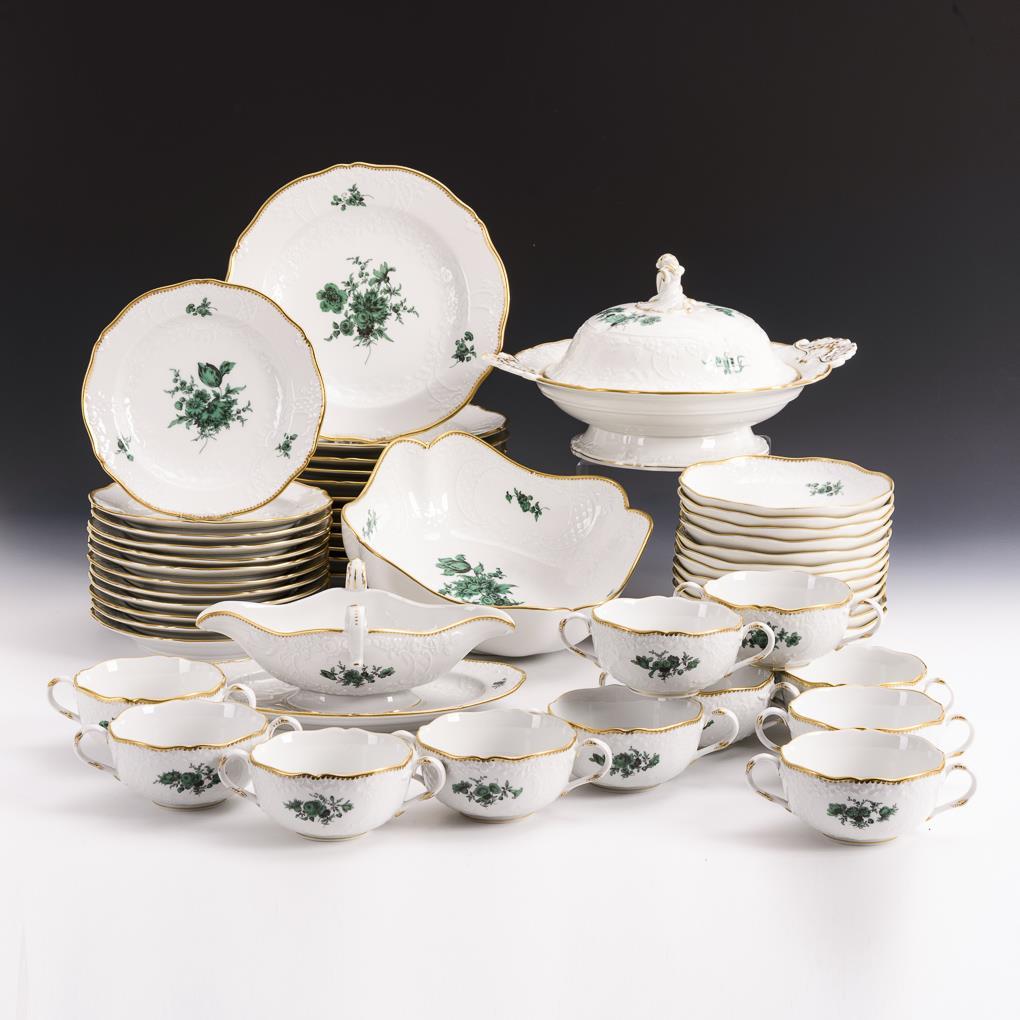 Speiseservice mit kupfergrüner Blumenmalerei. Meissen.