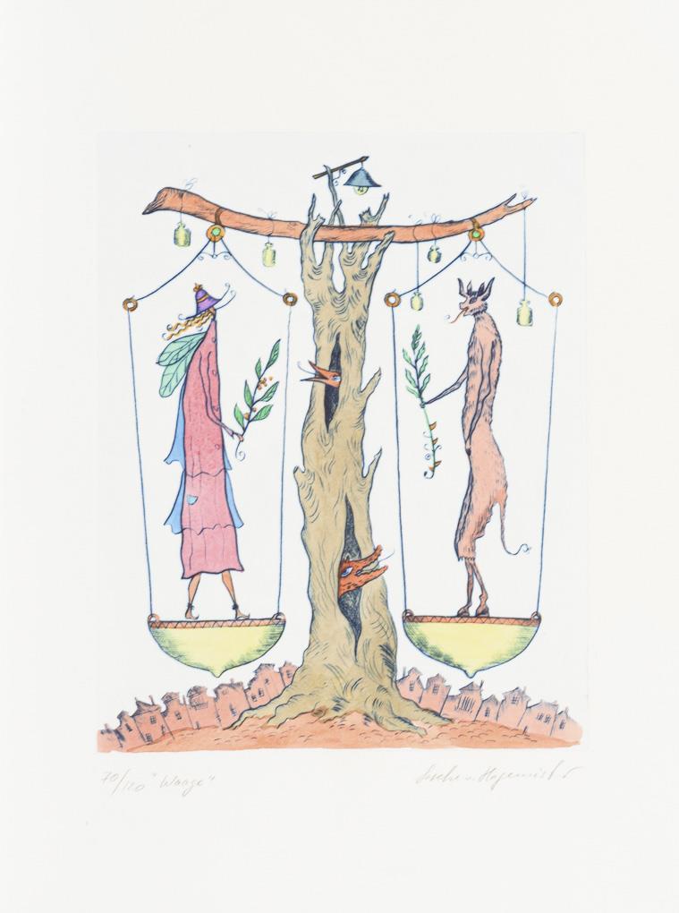 Aquarellierte Radierung. Bleistiftsignatur. Exemplar: 70/120.