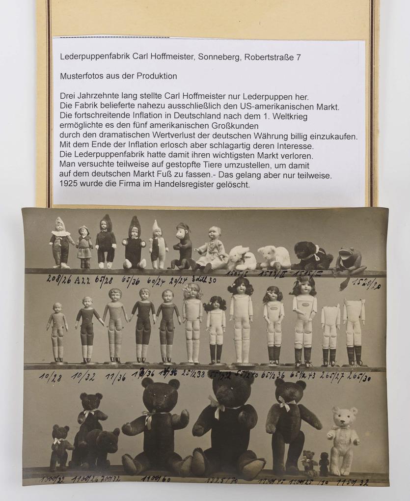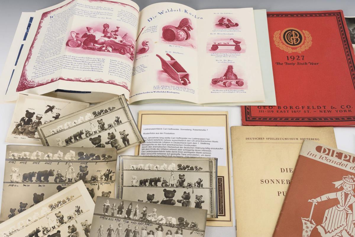 Konvolut alte Werksfotografien: 7 Fotos, 2 Postkarten aus dem Spielzeugmuseum Sonneberg, 6 Musterfotos aus der Produktion von Carl Hoffmeister, Sonneberg (1920er Jahre), 3 Musterfotos mit Sonneberger Puppen von Arthur Schoenau und Ernst Döberich. / Warenkatalog aus dem Jahr 1927 "The Forty Sixth Year" mit Sortiment von Geo. Borgfeldt. / "Die Puppe im Wandel der Zeiten" von Emmy Lehmann (Schriftenreihe des Deutschen Spielzeugmuseums, 1957). / "Die Sonneberger Puppe" (Sonderdruck aus "Thüringer Heimat", 4/1957). / Katalog "Waldorfschul-Spielzeug" o. J. / Neujahrsgruß 1967 mit persönlicher Unterschrift von Otto Keil (Direktor des Deutschen Spielzeugmuseums Sonneberg). / Alte Eintrittskarte Spielzeugmuseum Sonneberg. / Hinweisblatt zur "Pflege der Käthe-Kruse-Puppen", aus altem Katalog, 1940er Jahre.