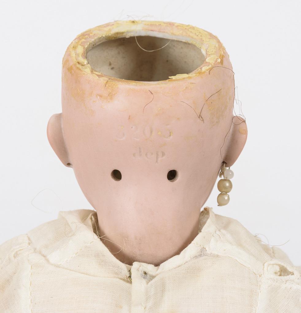 Kurbelkopf, blaue Schlafaugen, Ohrlöcher. 9-teiliger Gliederkörper mit festen Handgelenken. Gelockte Kunsthaarperücke, weißes Kleid, braune Schuhe, Strohhut mit Blumen. Kopf durchleuchtet: ohne Defekte. Körper mit Defekten, Arme geklebt, 2 Finger fehlen.