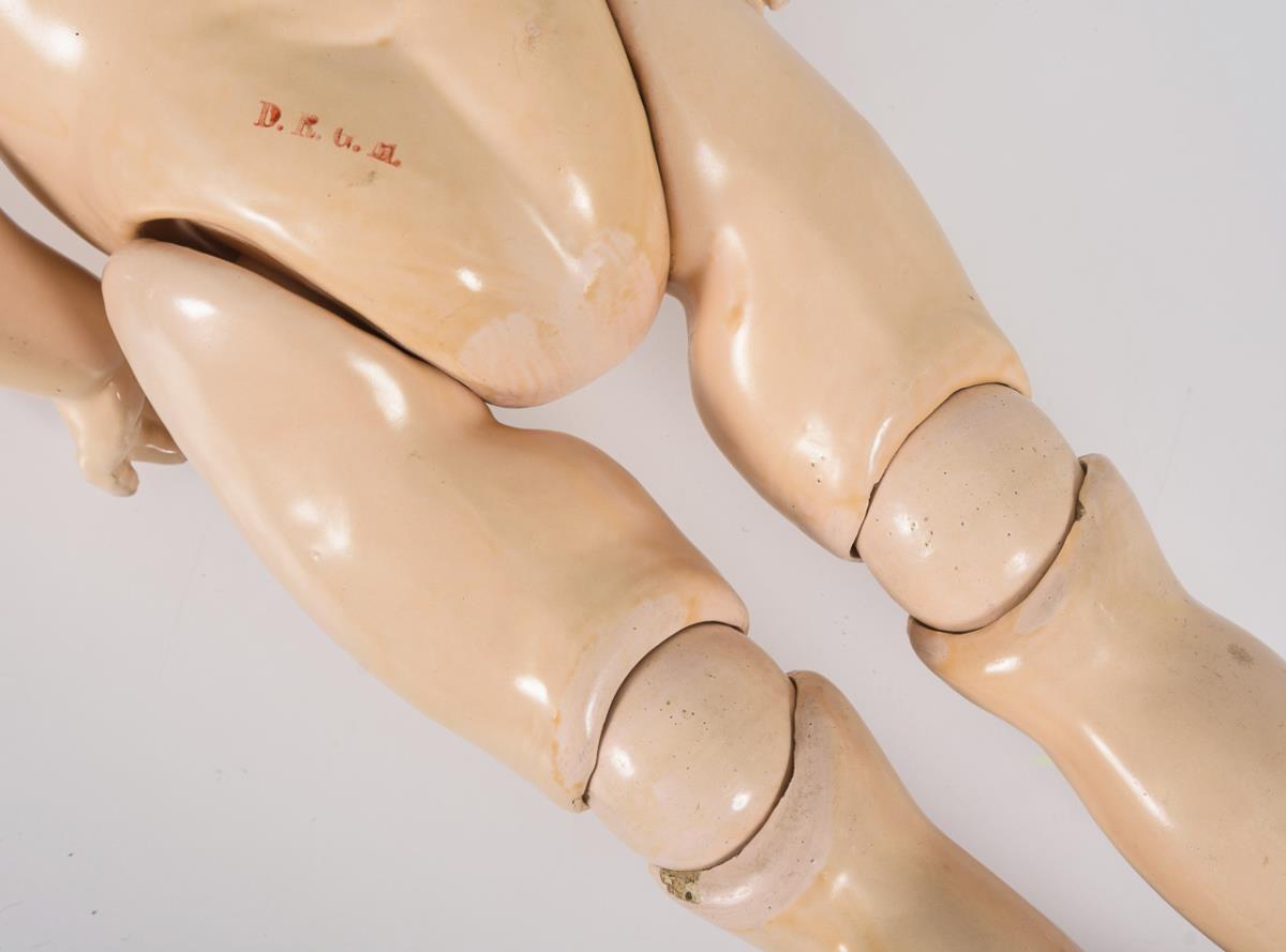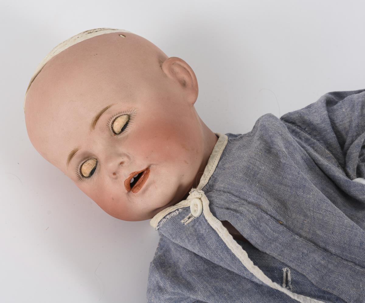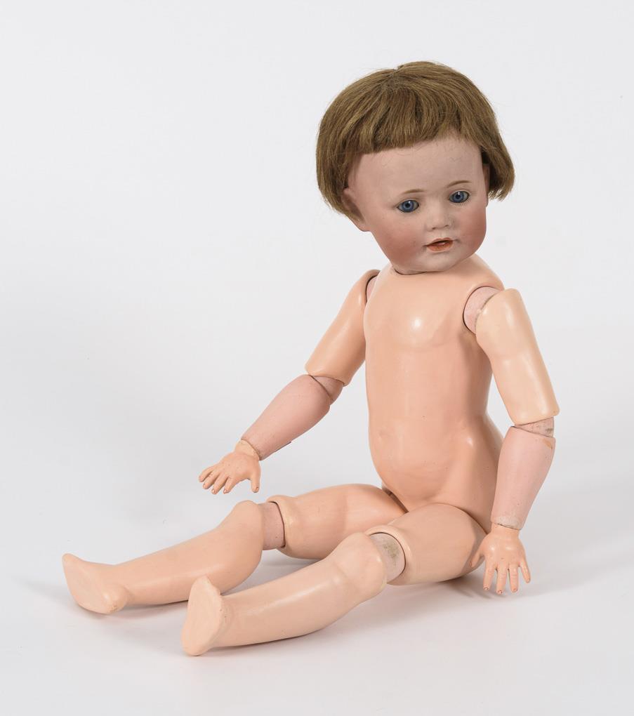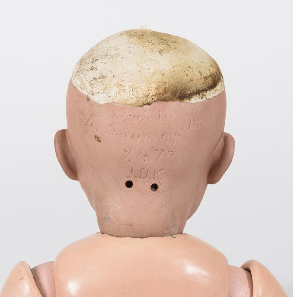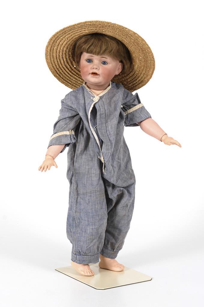 Kurbelkopf, blaue Schlafaugen, brünette Echthaarperücke. 15-teiliger Gliederkörper mit rotem Stempel "Made in Germany". Blauer Anzug, dazu großer Strohhut. Fest vergipster Kopfdeckel: nicht durchleuchtet, jedoch ohne sichtbare Defekte.