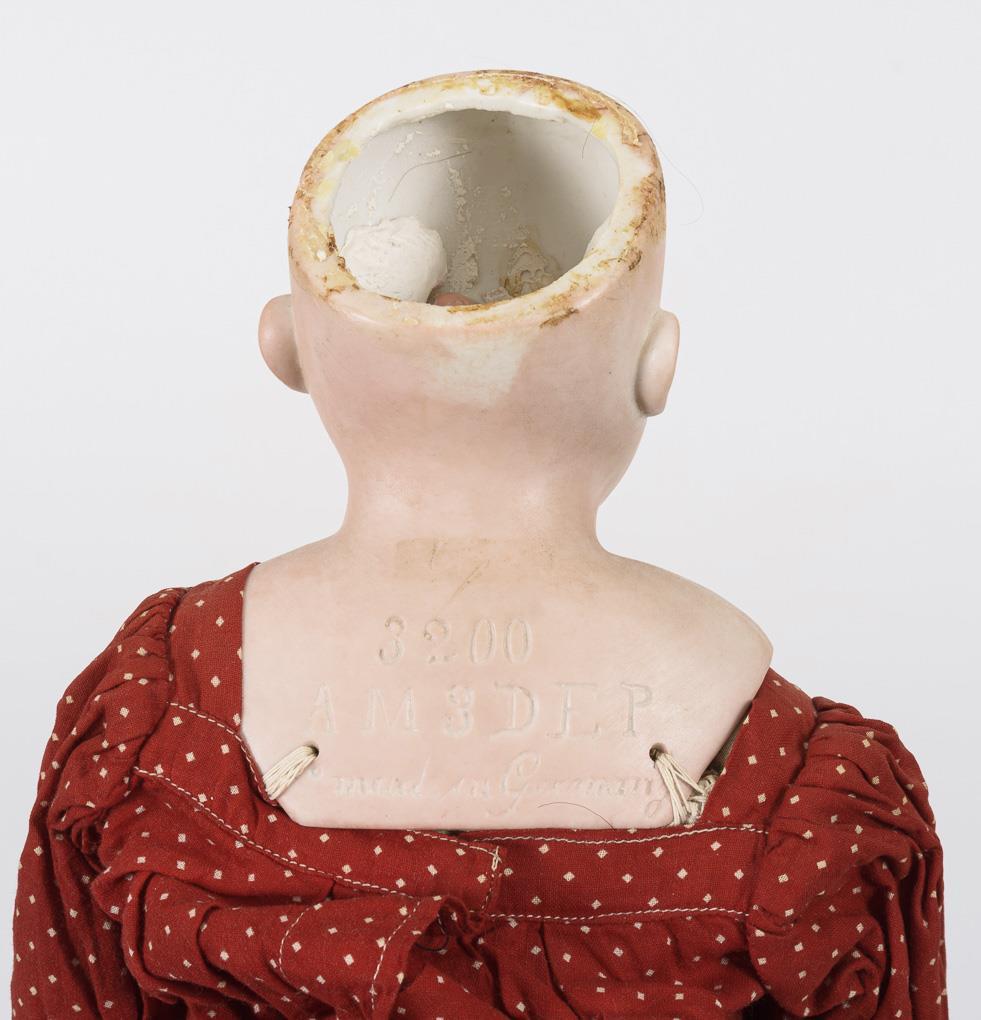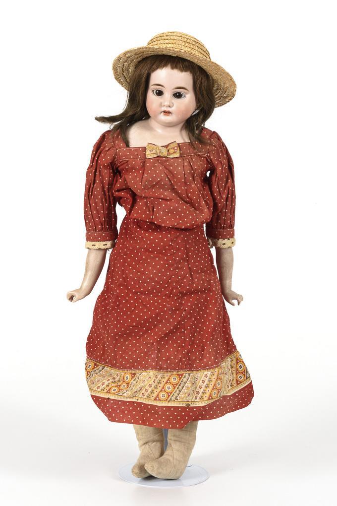 Brustkopf, braune Schlafaugen, braune Echthaarperücke. Stoffkörper mit Biskuitunterarmen. Rotes Kleid mit weißen Pünktchen, Strohhut. Kopf durchleuchtet: ohne Defekte. 2 Finger bestoßen.