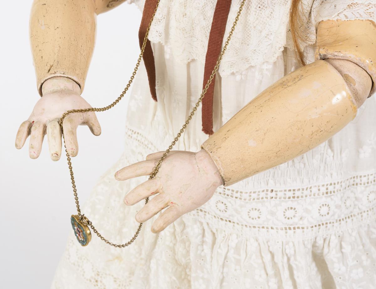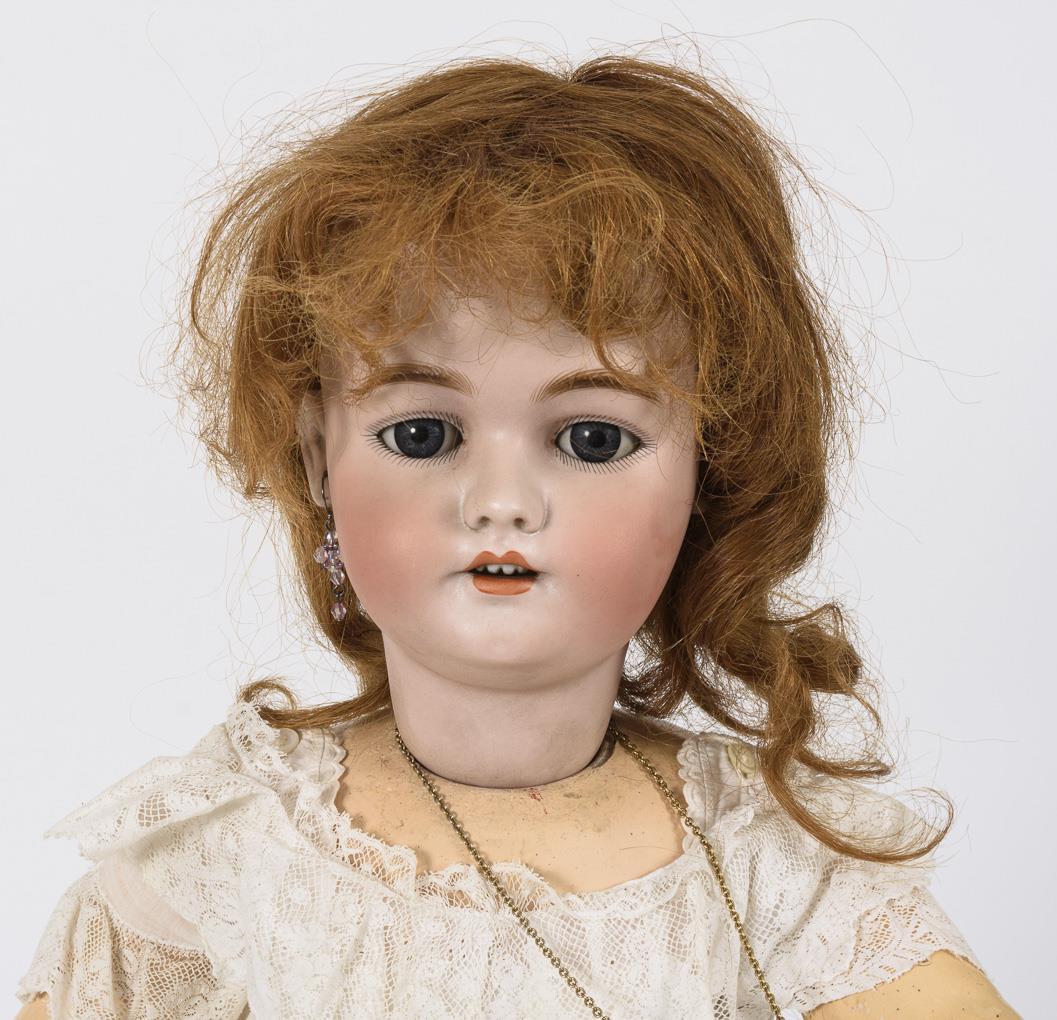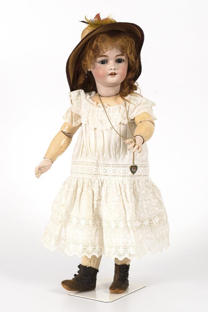 Kurbelkopf, blaue Schlafaugen, Ohrringe, rotbraune Echthaarperücke. 17-teiliger Gliederkörper. Weißes Kleid, Schutenhut aus Stroh, alte braune Lederschuhe. Kopf durchleuchtet: ohne Defekte. Körper mit kleinen Farbdefekten, Hände abgewaschen.