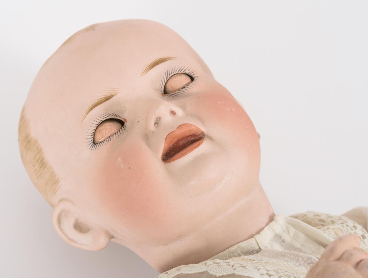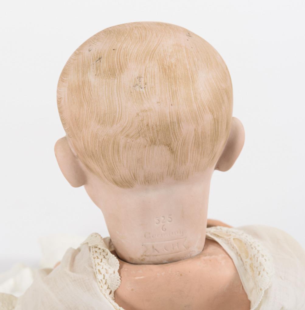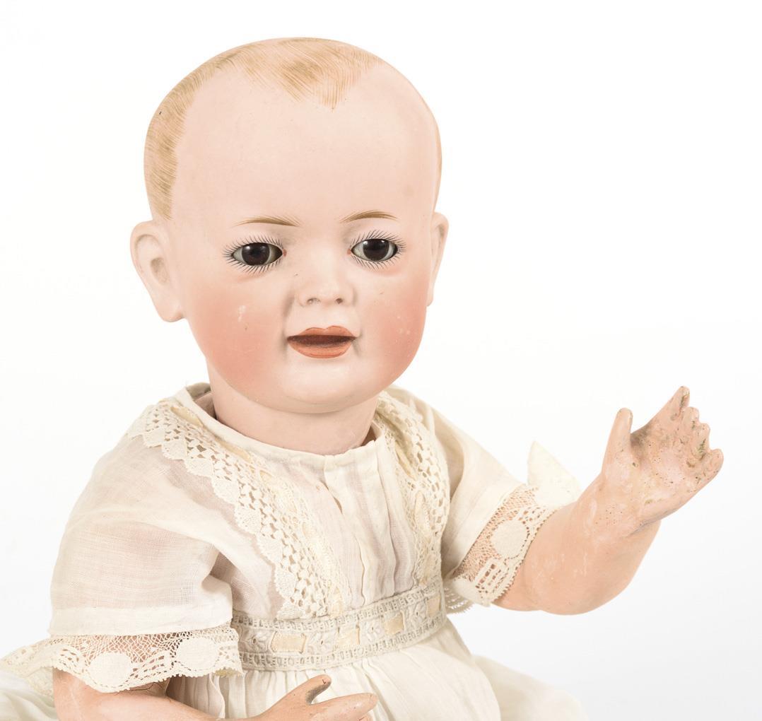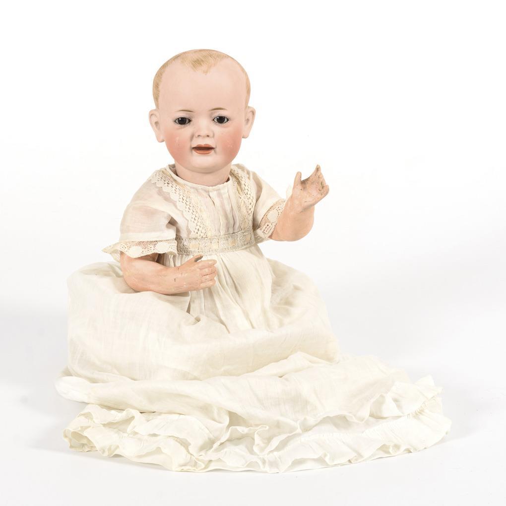 Vollkopf, braune Schlafaugen, offen/geschlossener Mund, gestrichelte Haare. 5-teiliger Sitzbabykörper. Weißes Taufkleid. Winziger Chip im rechten Augenwinkel, partiell übermalter Körper mit kleinen Farbdefekten.