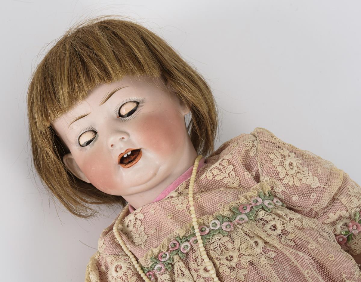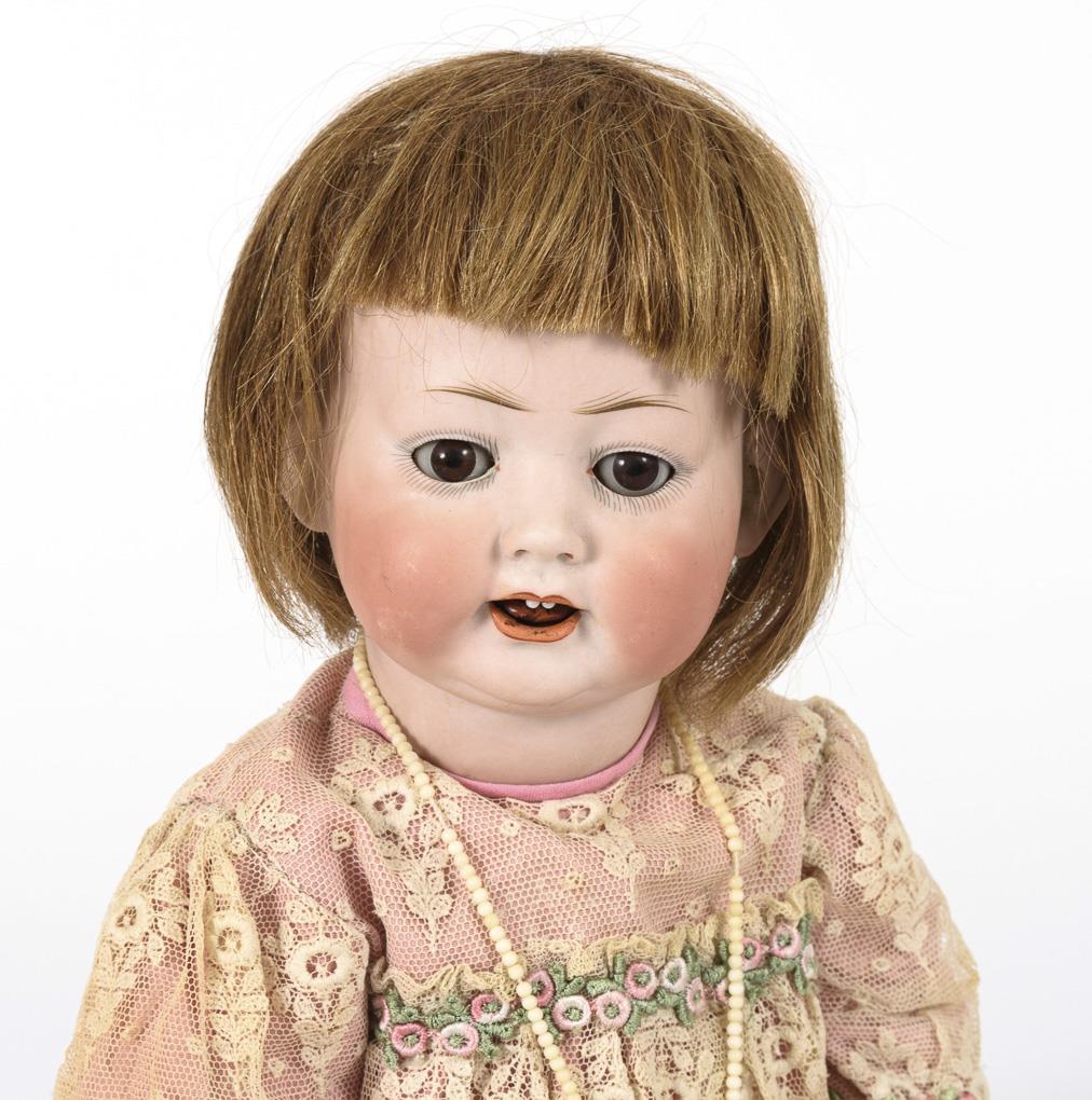 Kurbelkopf, braune Schlafaugen, mittelblonde Echthaarperücke. 5-teiliger Sitzbabykörper. Rosa Kleidchen, weiße Haube, rosa Schuhe. Kopf durchleuchtet: ohne Defekte. Hände und Zehenspitzen etwas berieben.