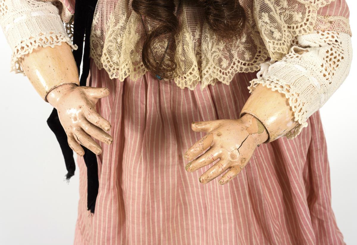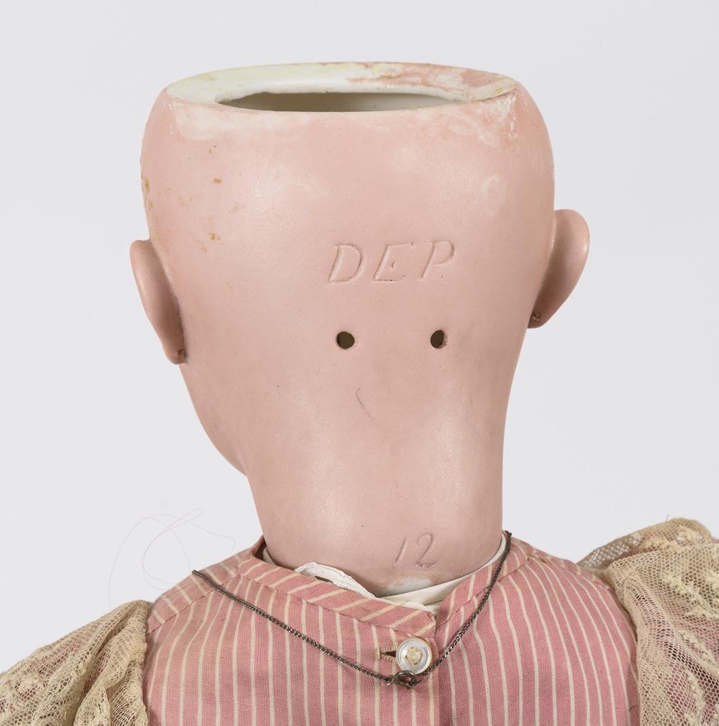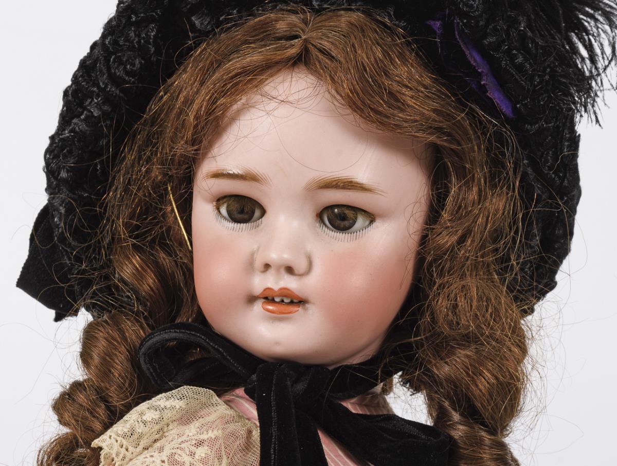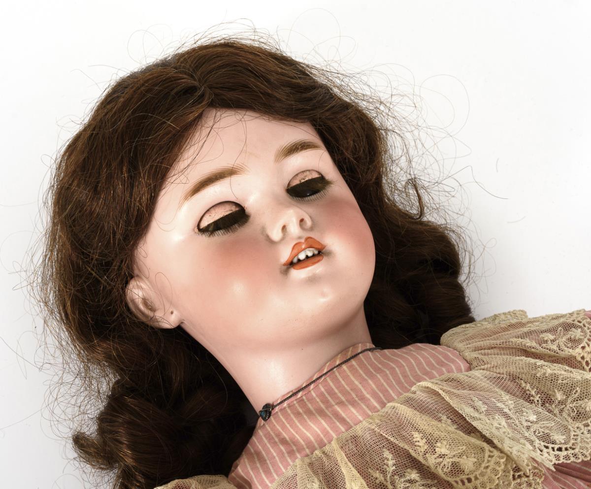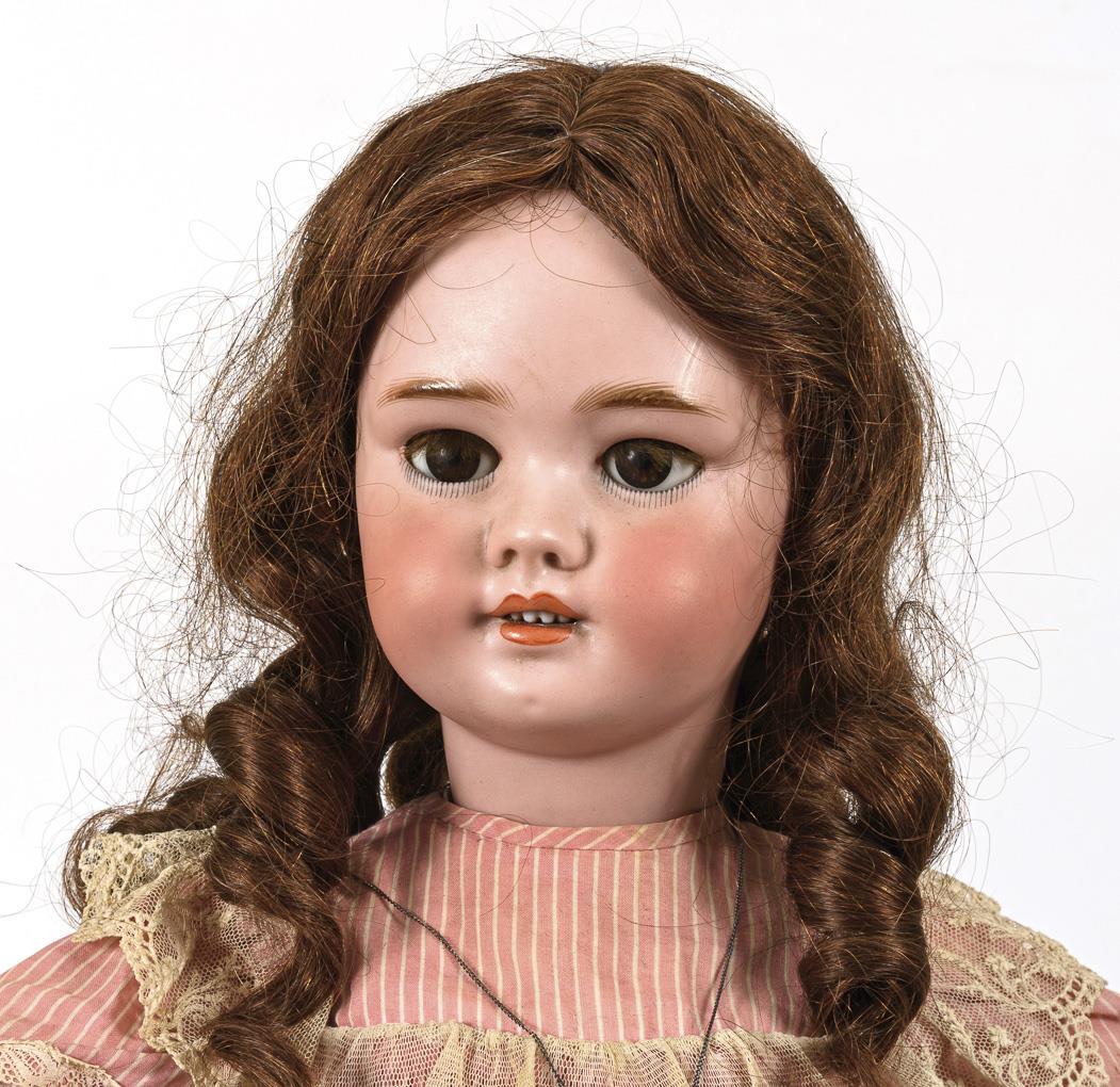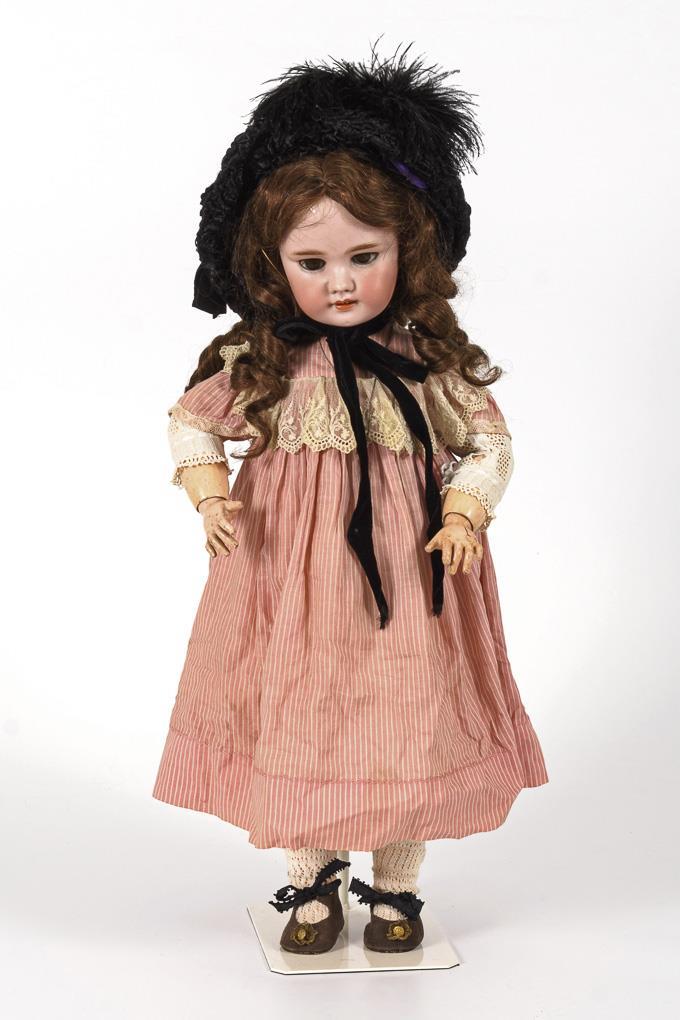 Kurbelkopf mit ergänztem Gipsdeckel, braune Schlafaugen, Echthaarwimpern, Ohrlöcher, braune Echthaar-Lockenperücke. 11-teiliger Gliederkörper. Rosa Kleid mit Nadelstreifen, schwarzer Samthut mit Federn, braune Schuhe. Kopf durchleuchtet: ohne Defekte, lediglich kleine Retusche im rechten Augenwinkel. Körper mit Farbdefekten.