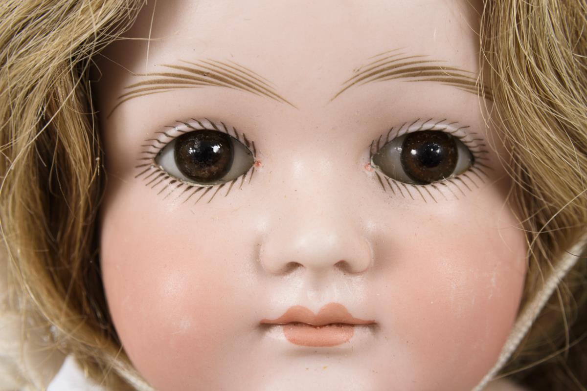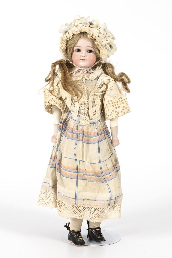 Brustkopf, feste braune Glasaugen, blonde Echthaarperücke. Schlanker Körper aus Stoff und Leder, mit Po- und Kniezwickeln. Kariertes Kleid, Haube mit Blumenschmuck, schwarze Schuhe. Haarriss am Schulterblatt hinten, Iris beider Augen restauriert, Arme und Beine mit Reparaturen, Unterarme ergänzt.