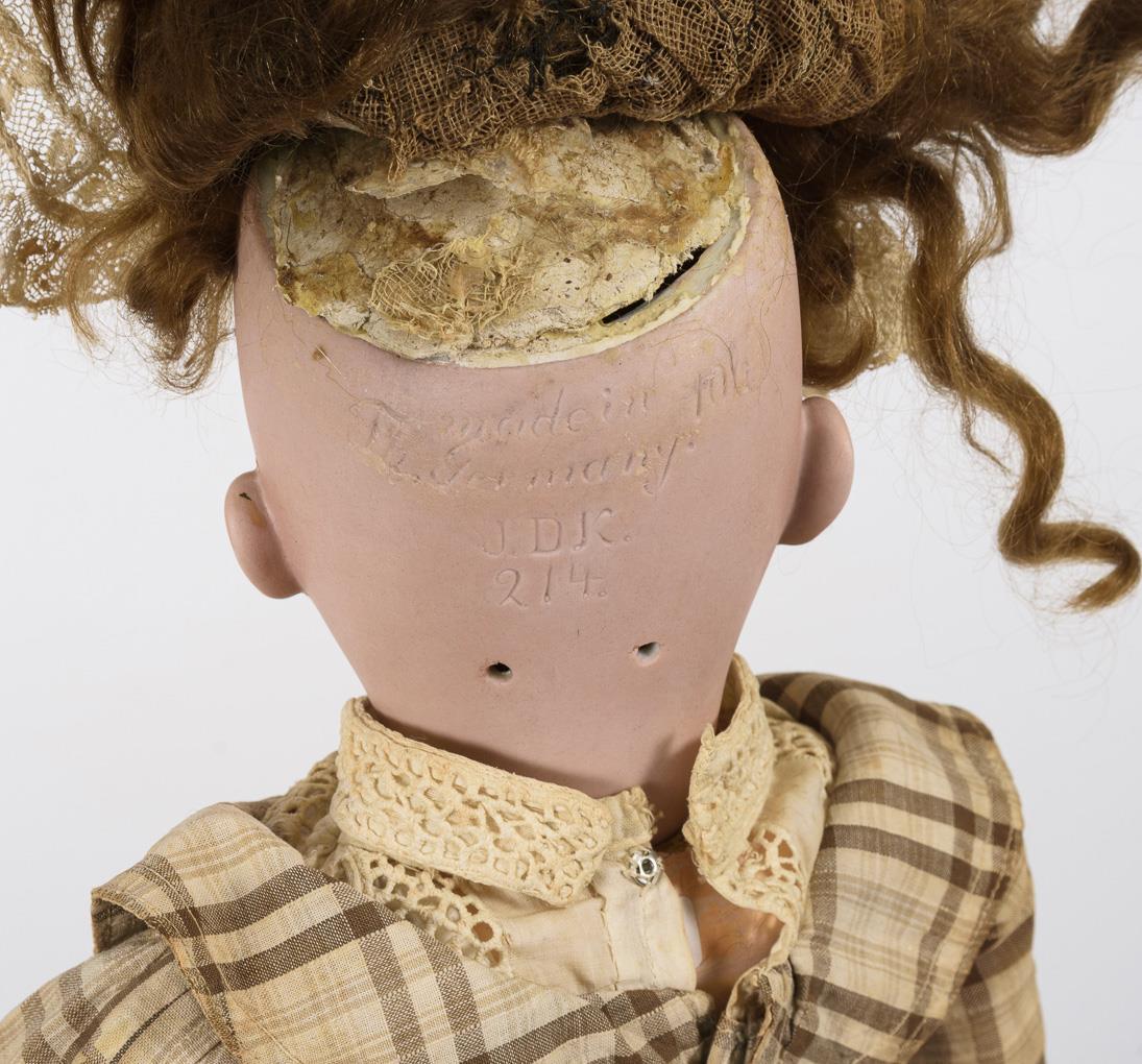 Kurbelkopf, braune Schlafaugen, hellbraune Mohairperücke. 17-teiliger Gliederkörper. Kariertes Kleid, weiße Spitzenhaube, schwarze Schuhe. Kopf nicht durchleuchtet: ohne sichtbare Defekte, lediglich 1 Augenlid bestoßen, 2 Finger defekt.